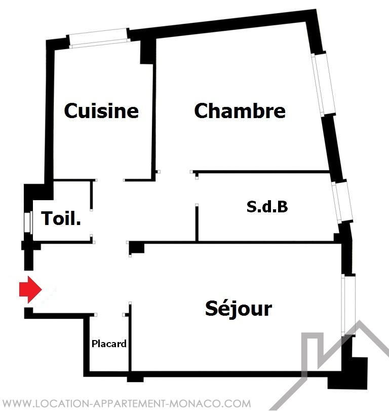 Hall d'entrée, séjour, chambre, cuisine équipée, salle de bains, toilettes invités, grand débarras.