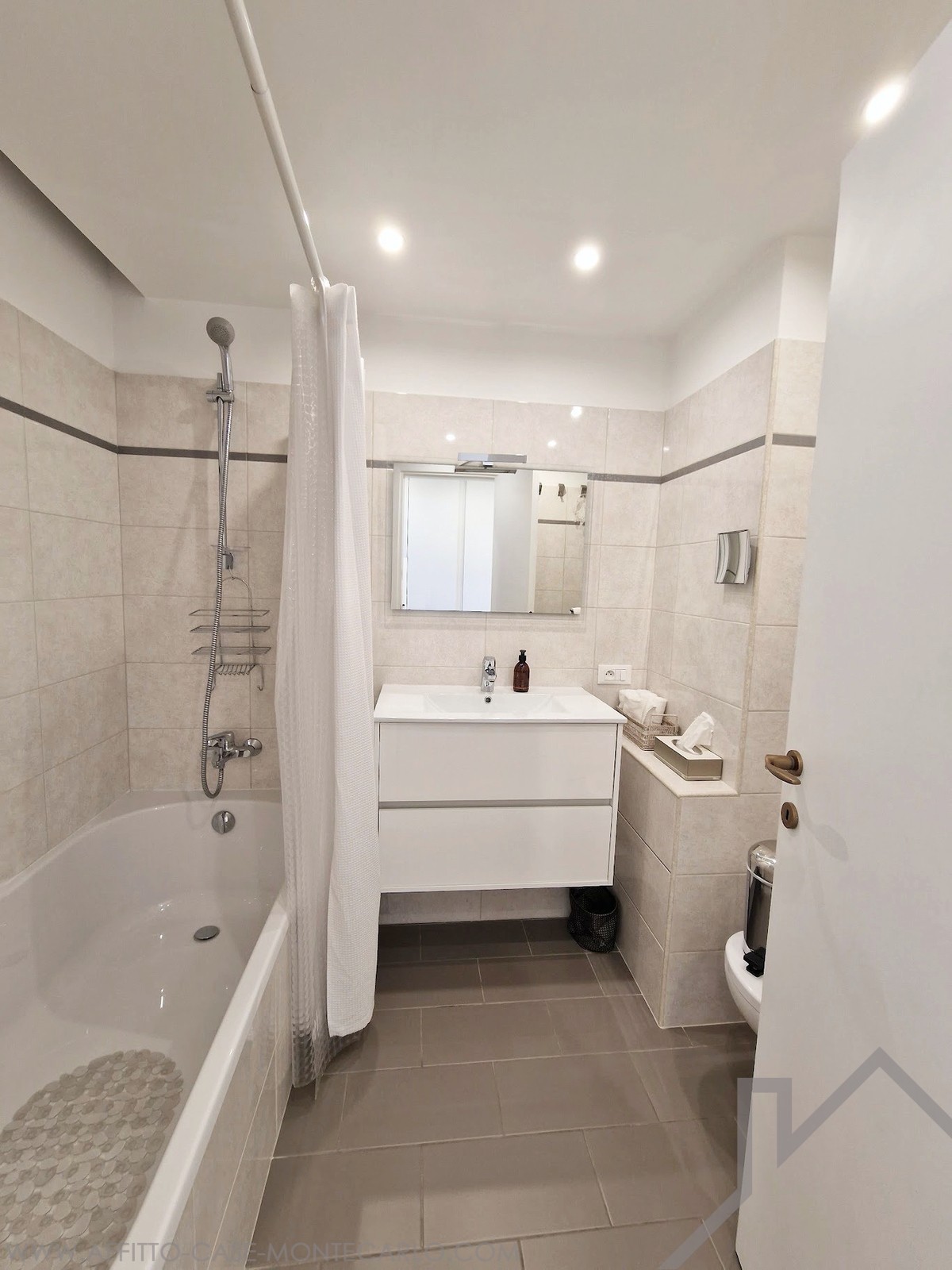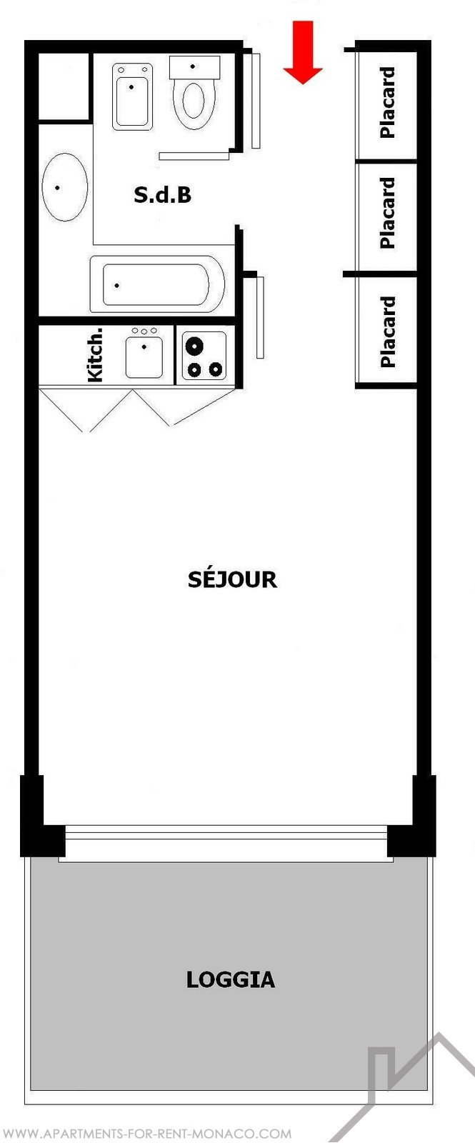 Entrée avec placards, séjour, kitchenette, salle de douche, balcon, climatisation