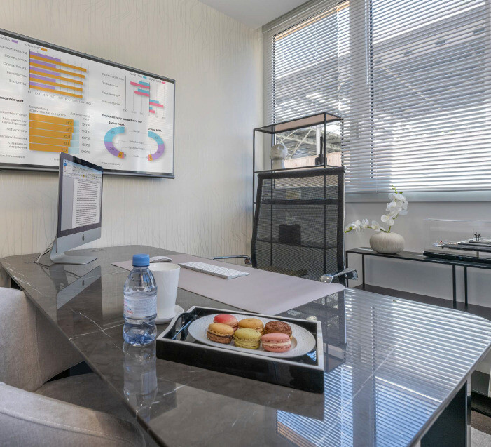 Enveloppés par des nuances de bleu clair, gris et marron, avec vue sur le quartier de Fontvieille et le Boulevard Charles III, ce bureau séparé par des cloisonnements en verre.