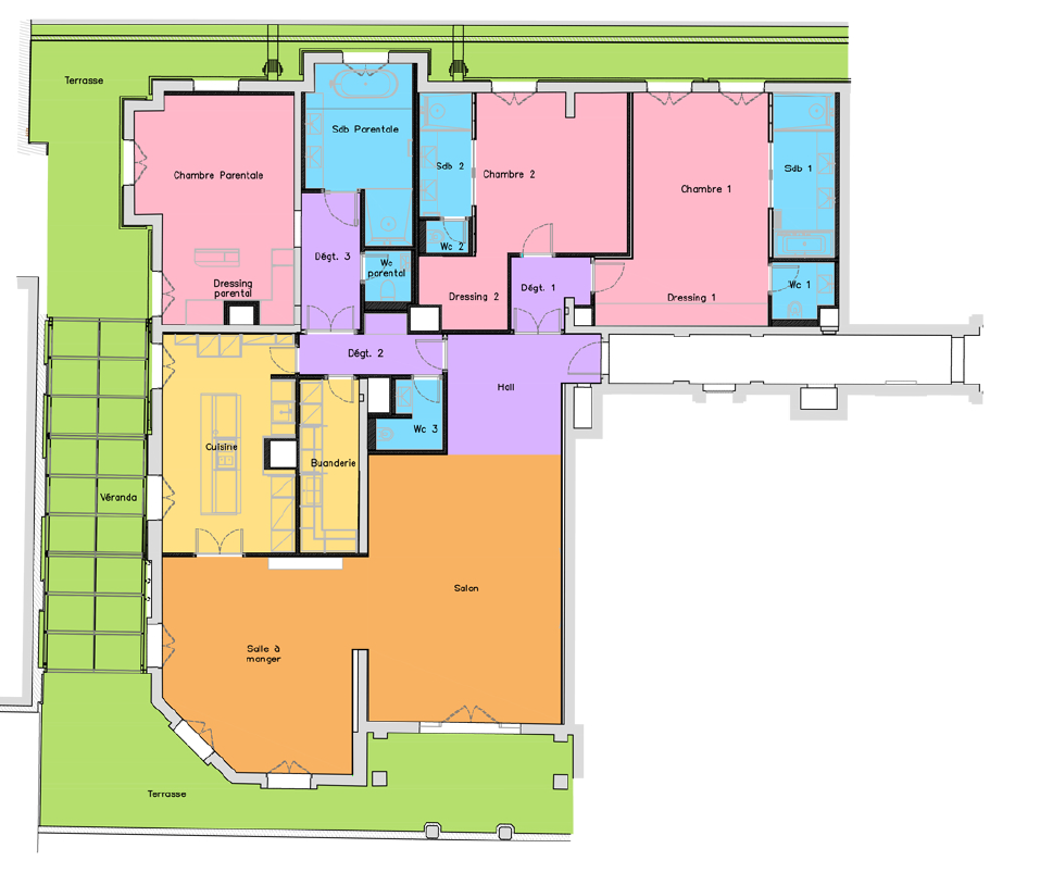 Il se compose de: un hall d'entrée, un salon ainsi que d'une salle à manger ouvrant sur une terrasse, une large cuisine équipée avec un îlot central le tout ouvrant sur la véranda, une chambre parentale avec dressings et salle de bains attenante, deux chambres avec chacune son dressing et sa salle de bains attenante. Toutes les chambres ouvrent sur une terrasse.