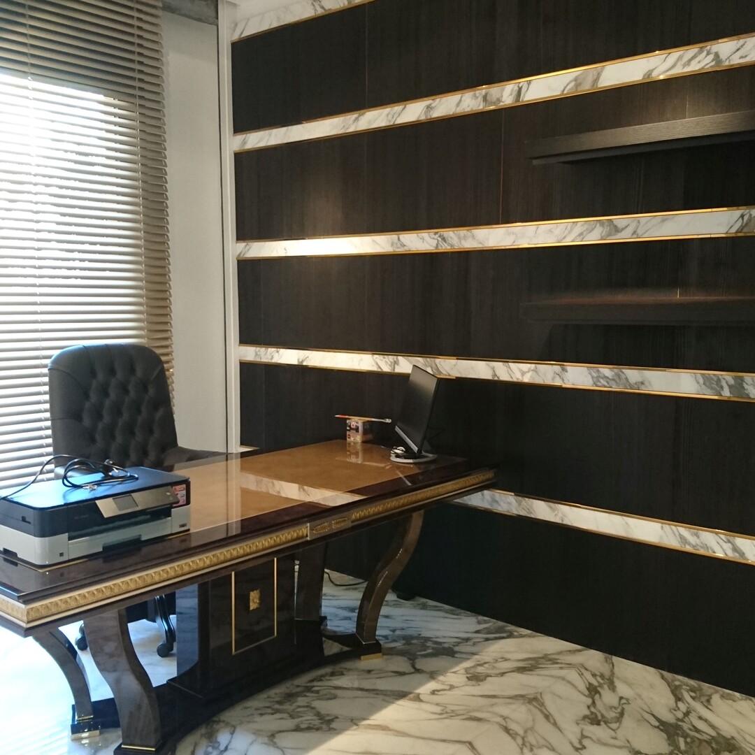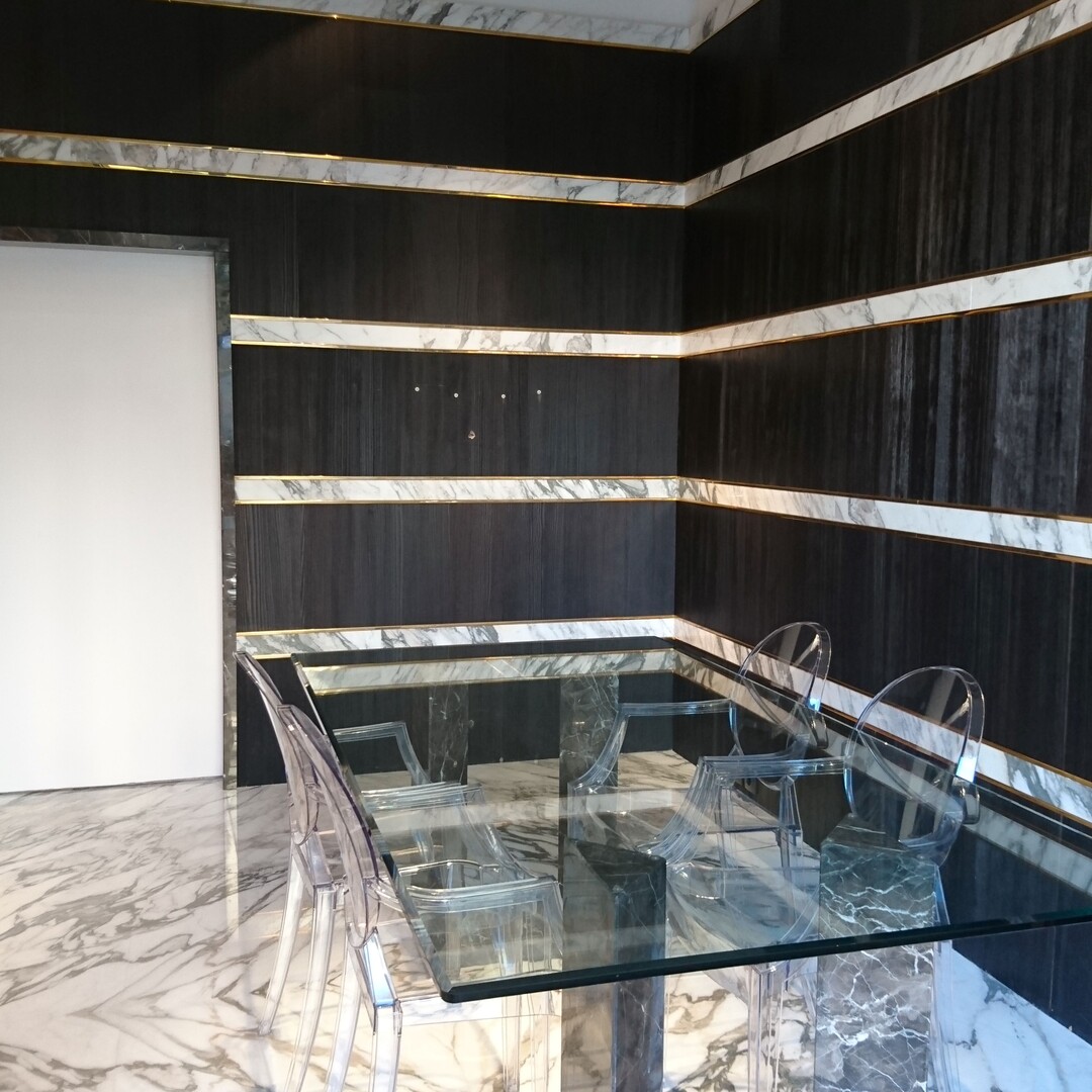 L'intérieur est élégamment fini avec des détails en marbre, contribuant à une ambiance de prestige. L'espace inclut également une salle de bain de service, des rangements pratiques et un placard.