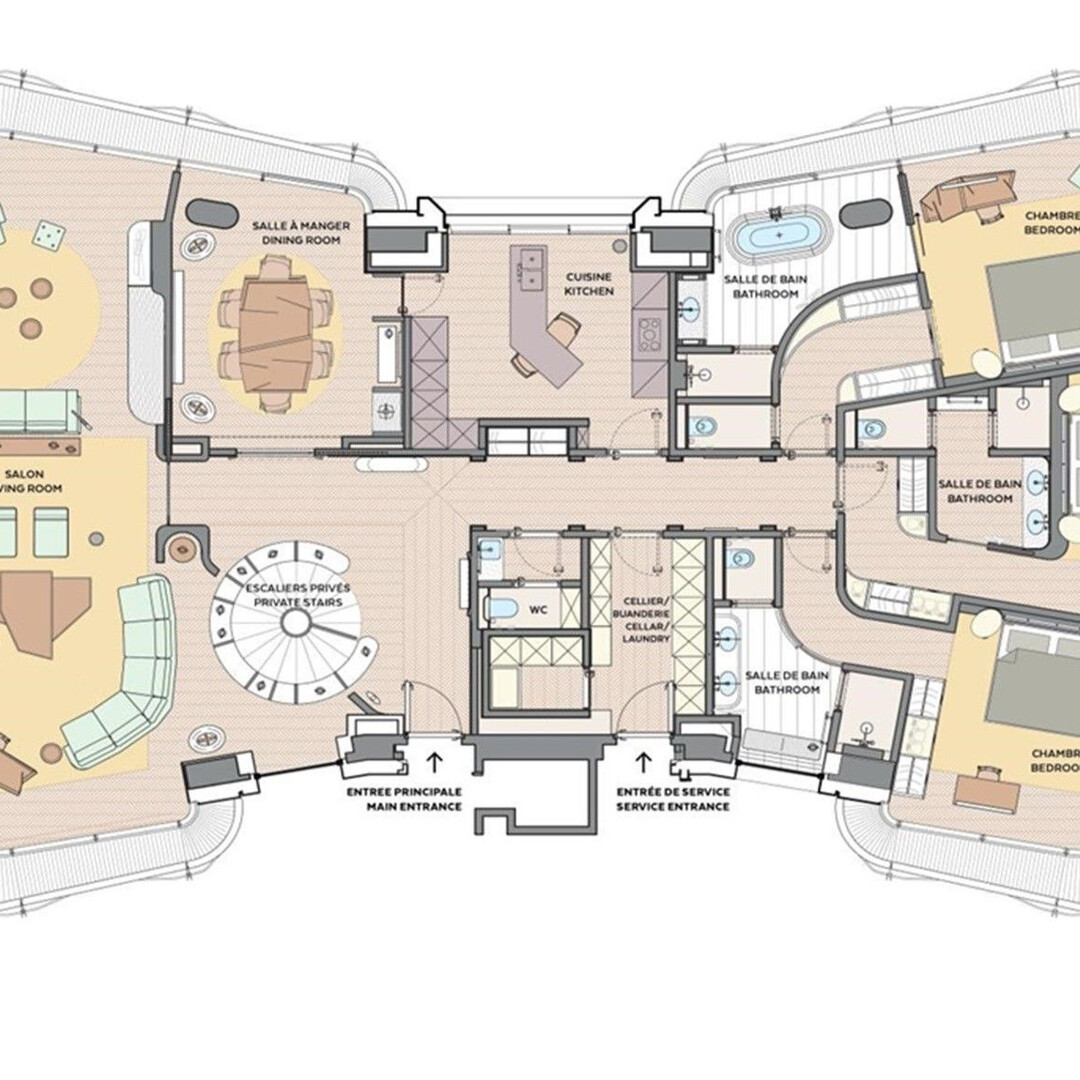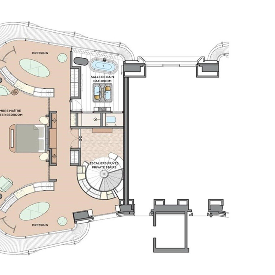 Loyer mensuel : 150 000 €/mois charges comprises (électricité, eau, climatisation, conciergerie et voiturier 24h/24). Prestations en supplément : room service, ménage, blanchisserie.
