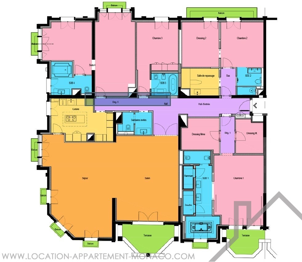 Il se compose d’un hall d’entrée, d’un salon et d’un séjour donnant sur terrasse, d’une cuisine indépendante entièrement équipée, d’une suite parentale avec terrasse, deux dressings et salle de bains, ainsi que de trois chambres, toutes pourvues de dressing ou salle de bains et ouvrant sur des balcons privés. Une salle de repassage et des toilettes invités complètent l’ensemble.