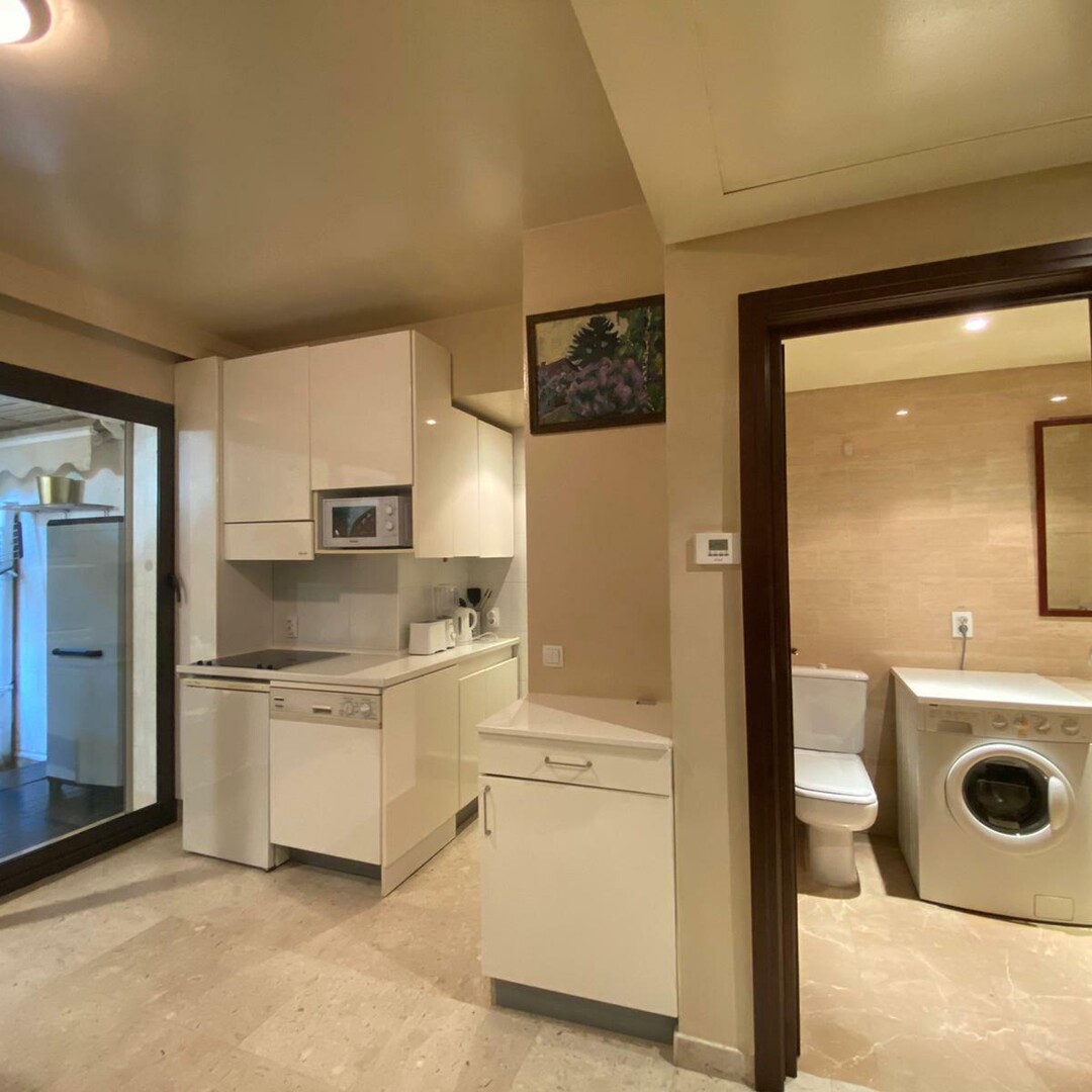 Entrée, porte blindée, pièce principale avec kitchenette équipée, grande salle de bain en marbre, grande cave avec
