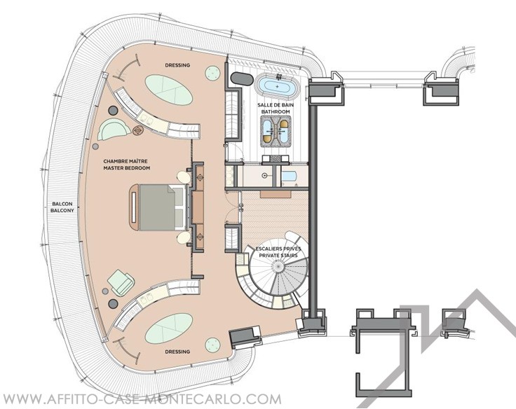 Escalier menant au niveau inférieur avec suite principale composé d'une grande chambre, salle de bains et 2 dressing. Terrasse vue sur l' Hôtel Hermitage.