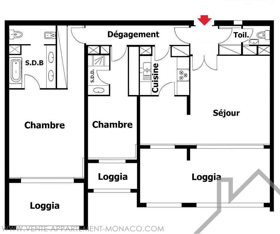 Hall d'entrée, dégagement, séjour et salle à manger donnant sur loggia, 2 chambres donnant toutes deux sur une loggia, salle de bains complète, salle de douche, toilettes invités, cuisine équipée, rangements, climatisation.