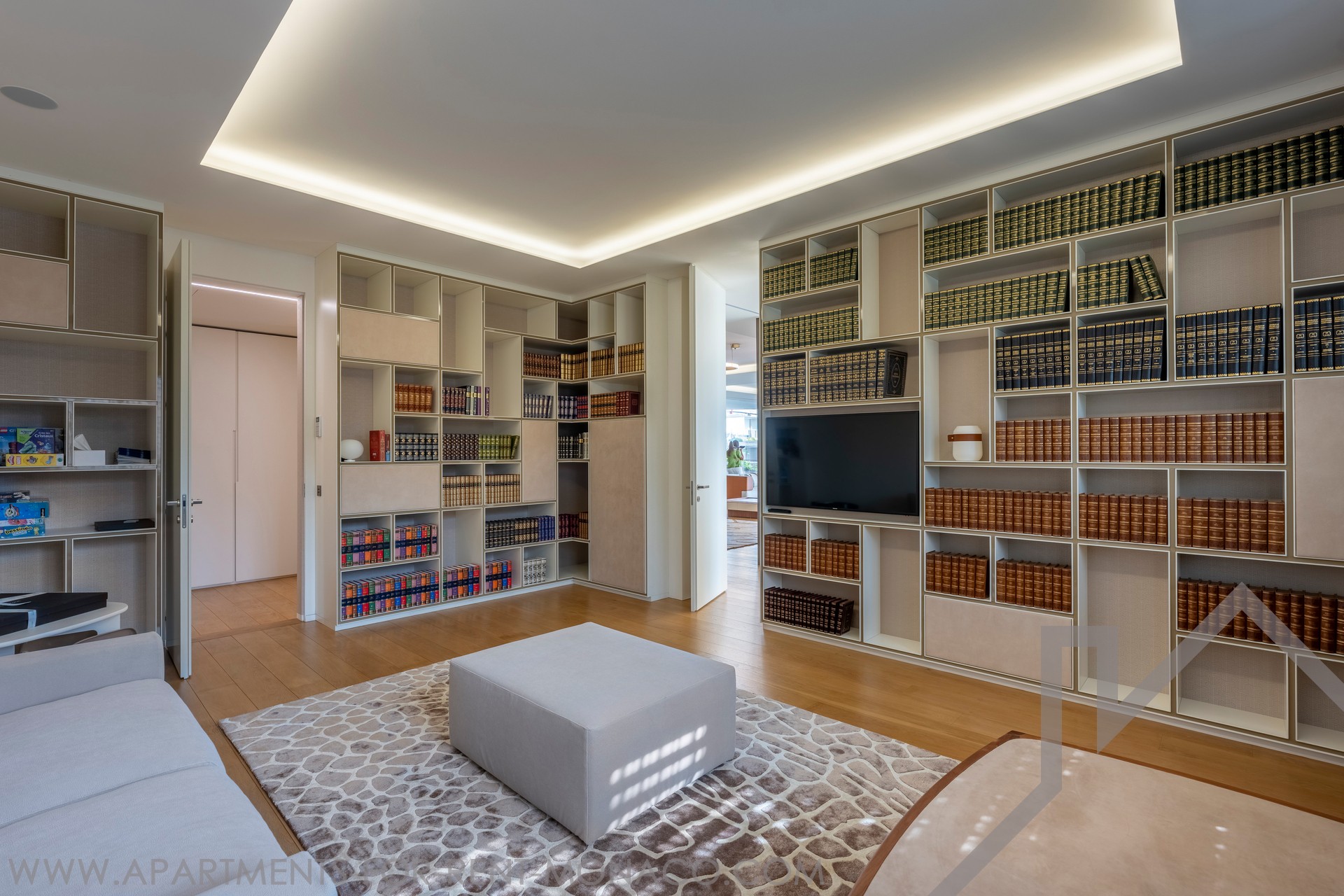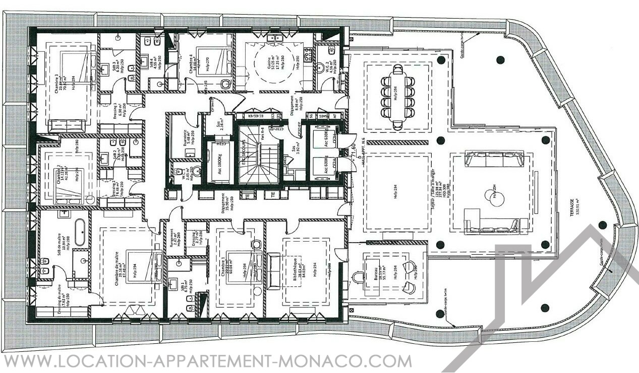 Cet élégant appartement se compose d’un hall d’entrée, d’un vaste séjour double prolongé par une profonde terrasse, d’une cuisine entièrement équipée, de cinq chambres en suite chacune avec sa salle d’eau et son dressing, d’une buanderie ainsi que d’un toilette invités.
