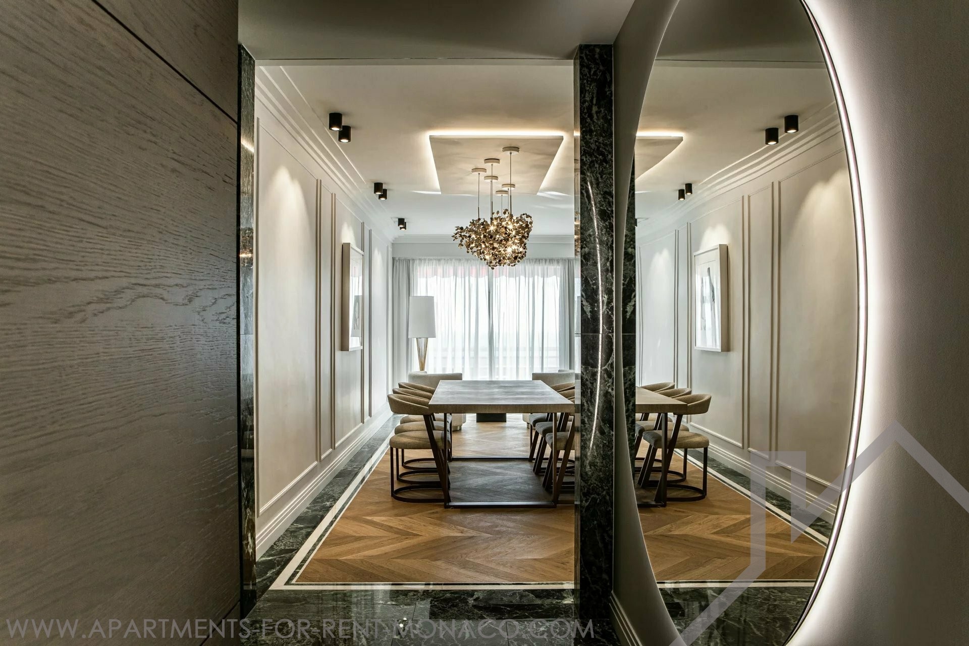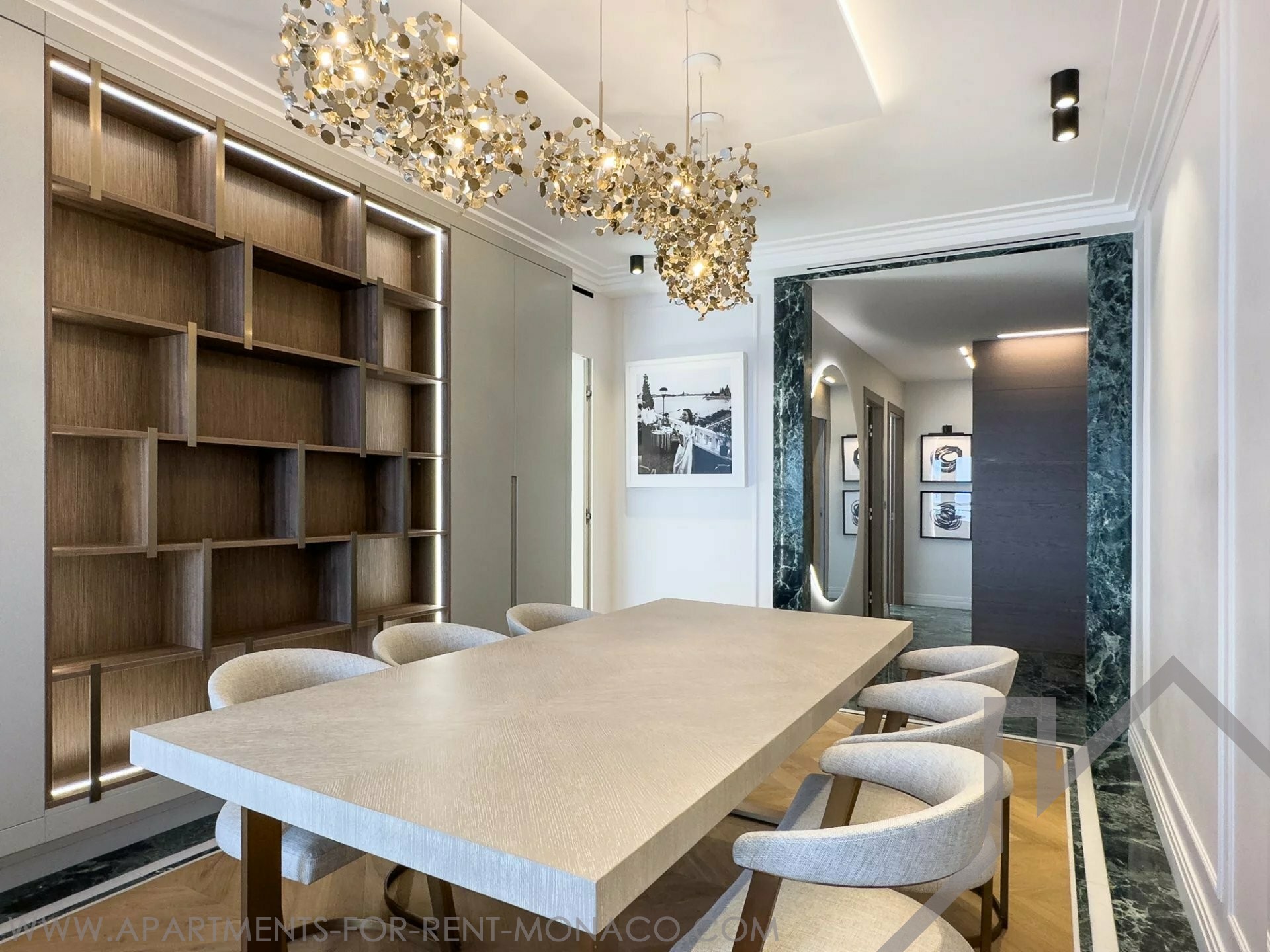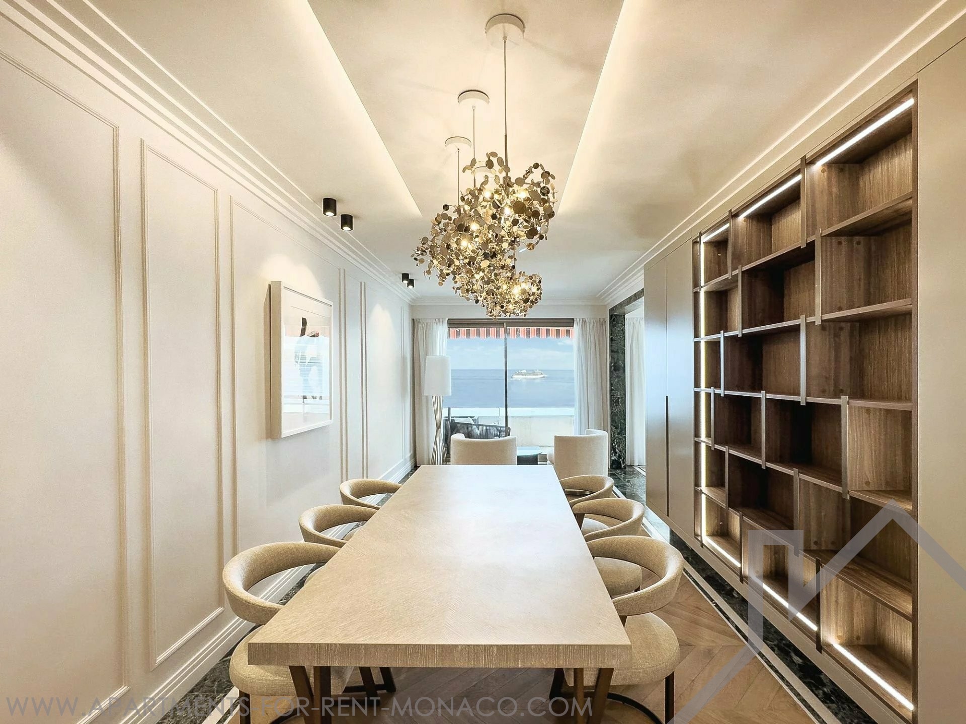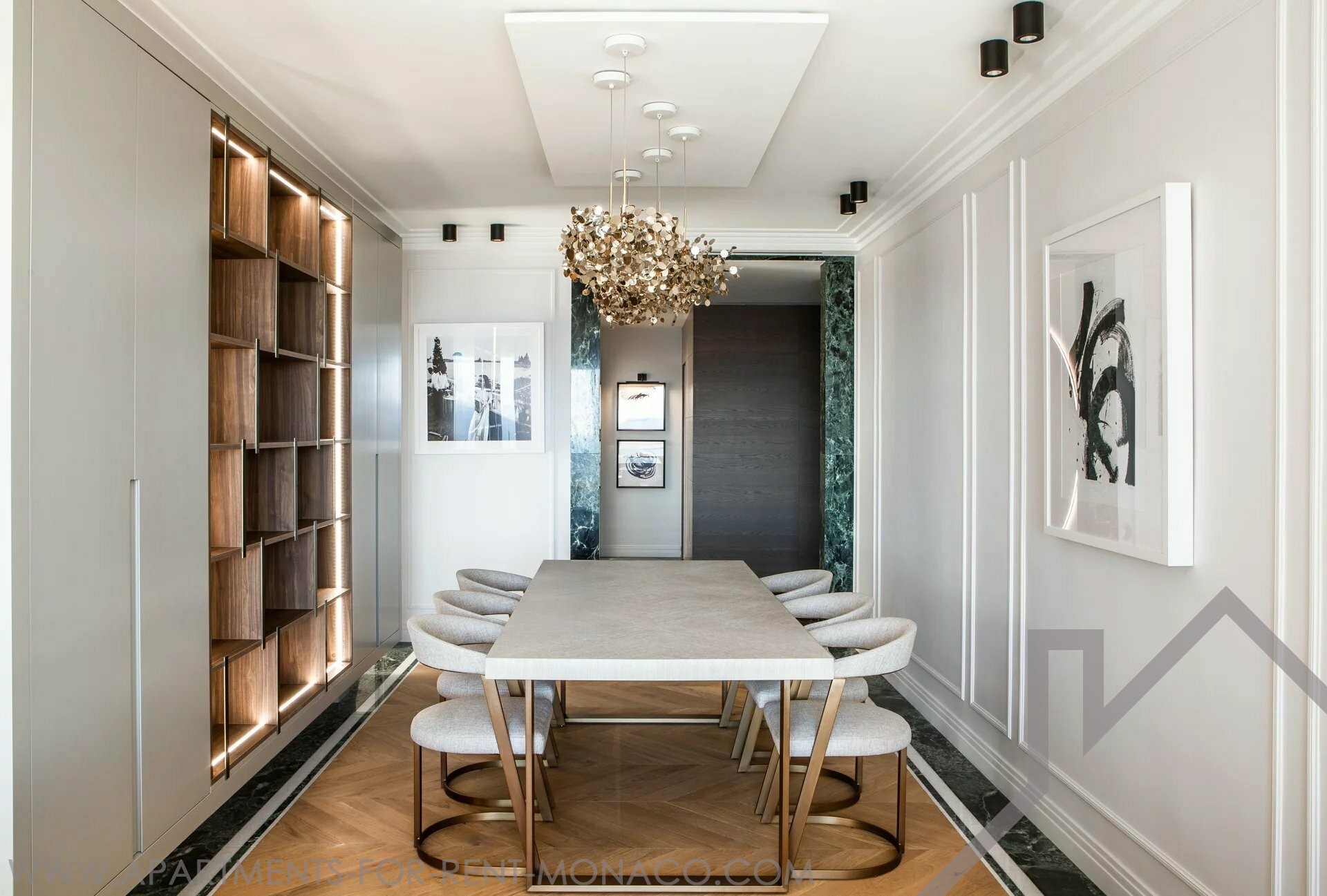 La salle à manger, séparée du salon, vous promet de beaux moments de partage conviviaux autour de cette table travaillée dans les tons beige et son pied de table en laiton doré, ses confortables fauteuils. L'élégance de cette pièce revient à la sélection du marbre dans des tons vert émeraude contrasté avec un parquet. Les moulures et corniches décorent merveilleusement bien cette pièce ouverte sur la terrasse où l'on profite de cette très belle vue mer.