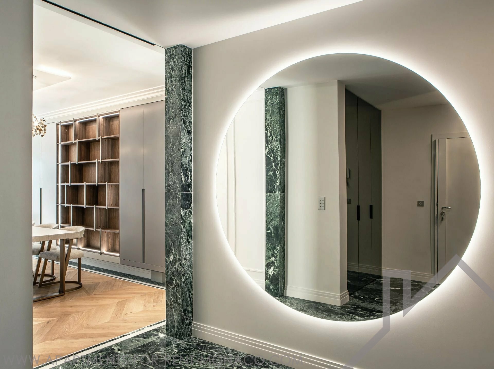 L'entrée de l'appartement vous accueille dans une ambiance calfeutrée, jouant avec la couleur du marbre vert émeraude et le contraste des murs blancs.