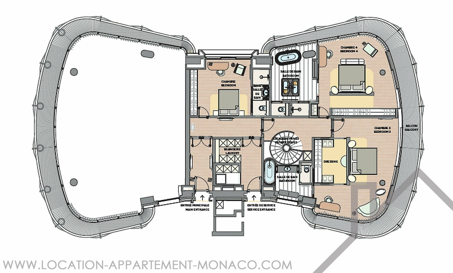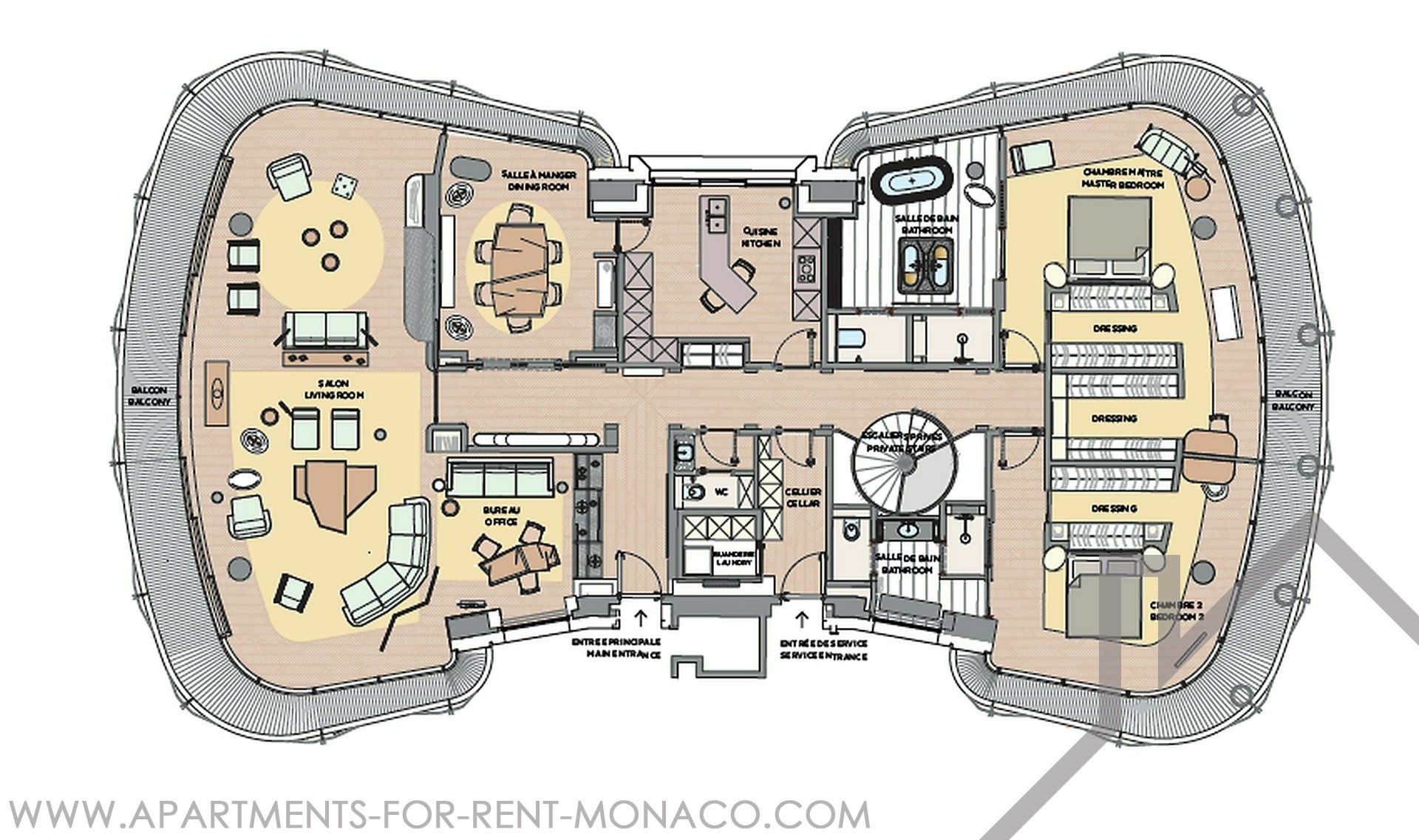 Ce duplex de 480 m² habitables s’ouvre sur 117 m² de terrasses offrant une vue sur la Principauté. Il comprend cinq chambres, chacune avec sa salle de bain, une salle à manger indépendante et de vastes espaces de réception aux volumes équilibrés. Loué non meublé, l’appartement dispose également de trois places de parking et d’une cave. Les finitions sobres et les proportions harmonieuses reflètent une conception pensée pour le confort et la lumière.