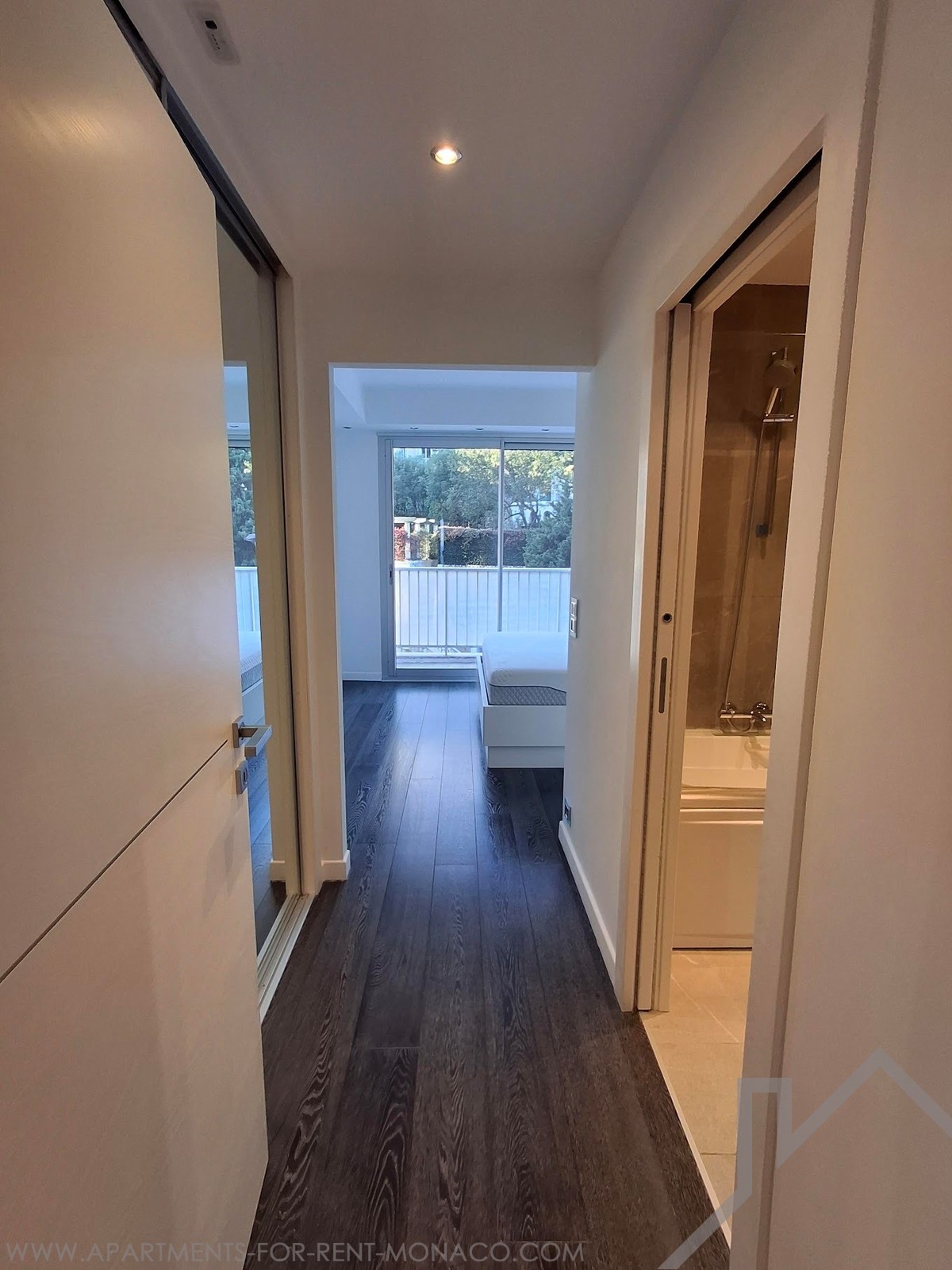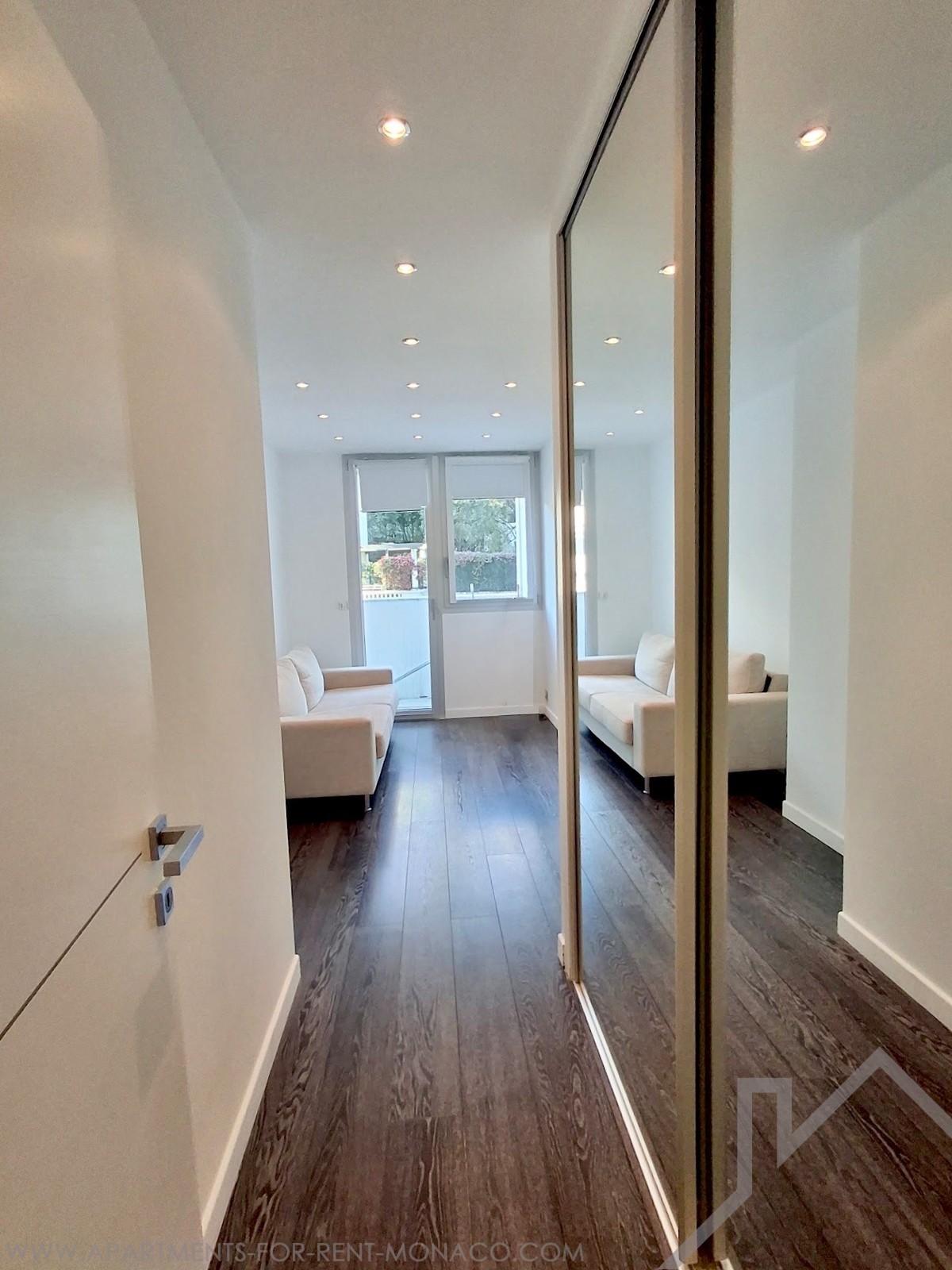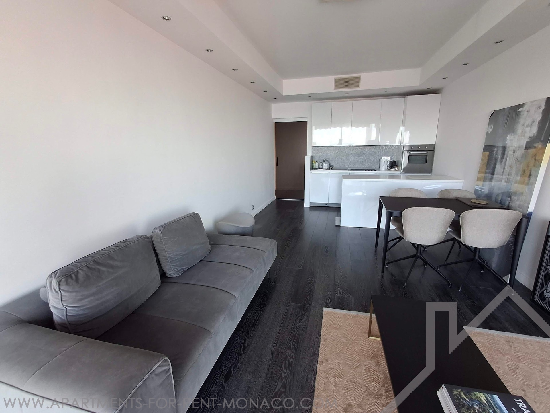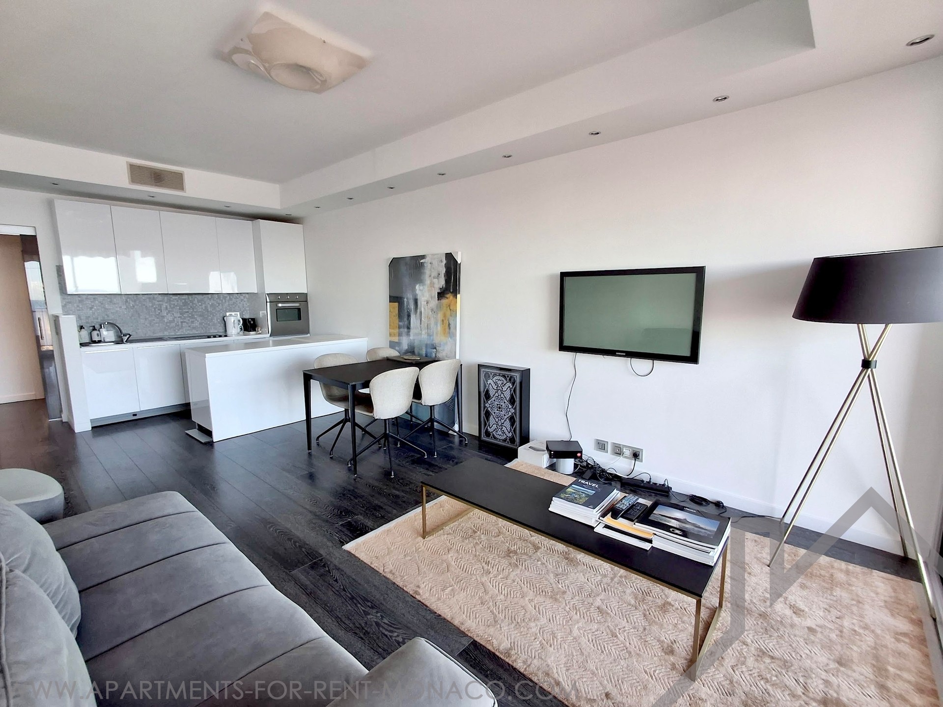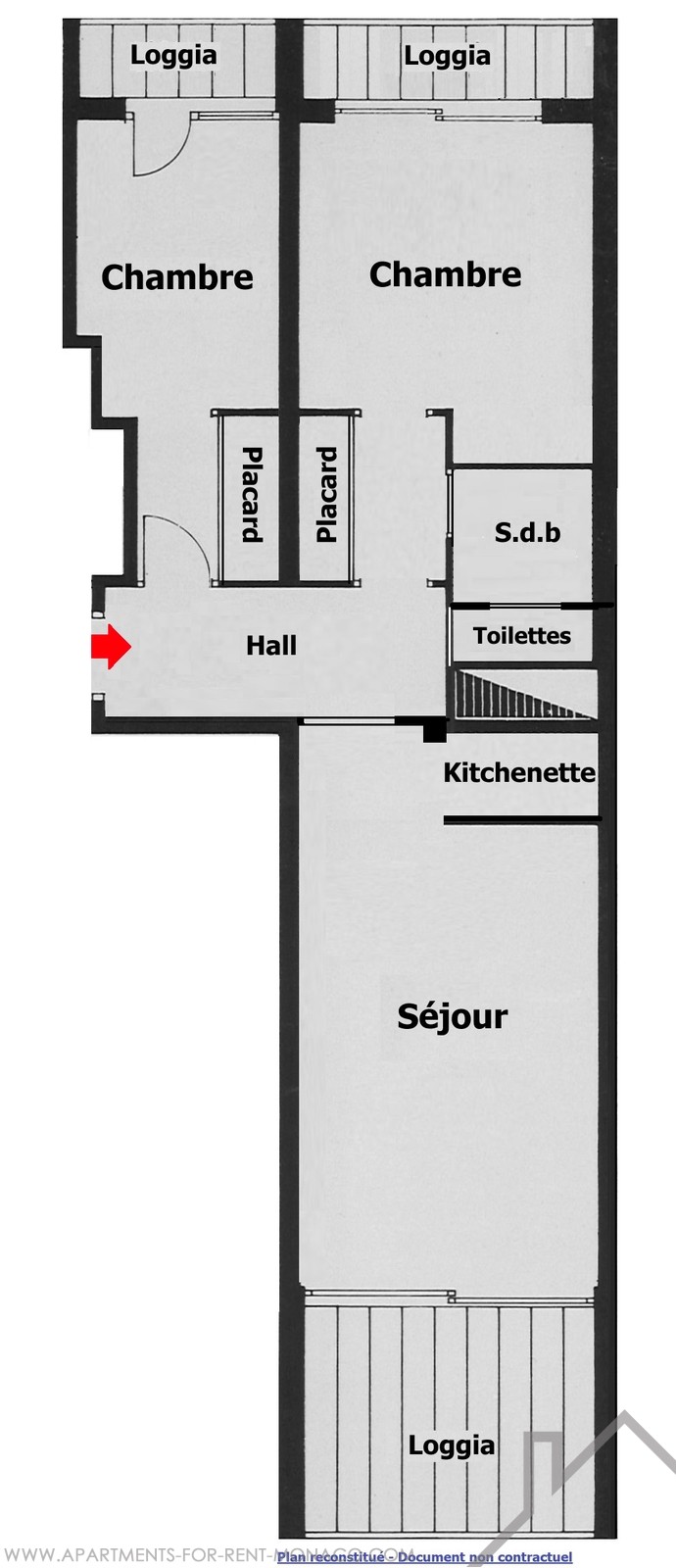Hall d'entrée, spacieux séjour ouvrant sur loggia, cuisine américaine entièrement équipée, deux chambres, salle de bains, placards, climatisation, double vitrage, loggias