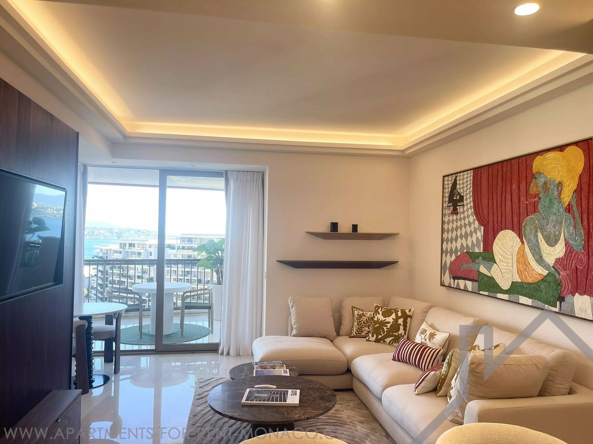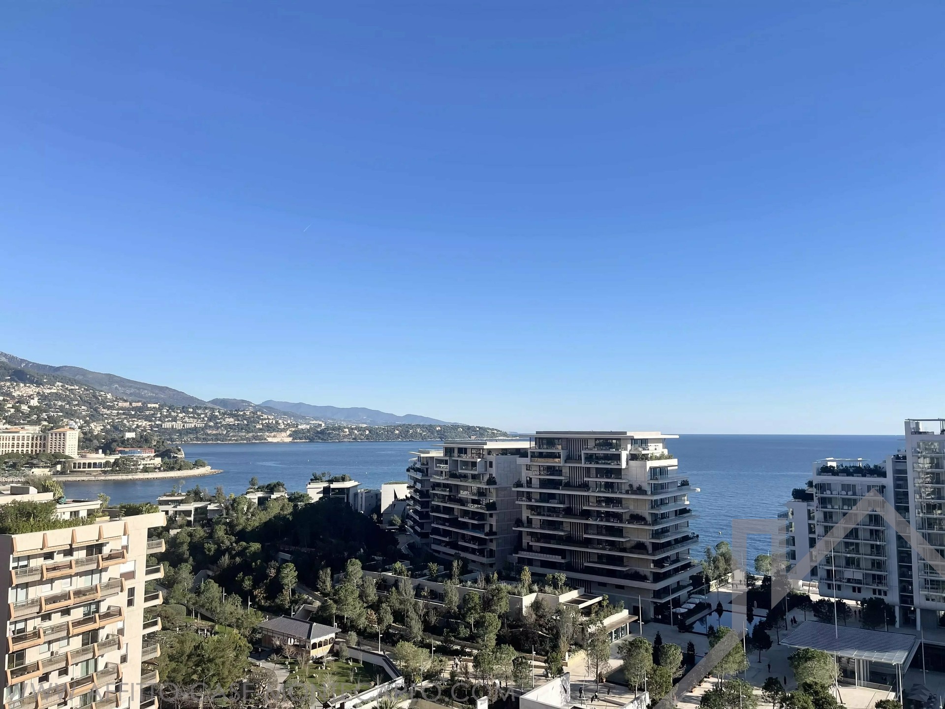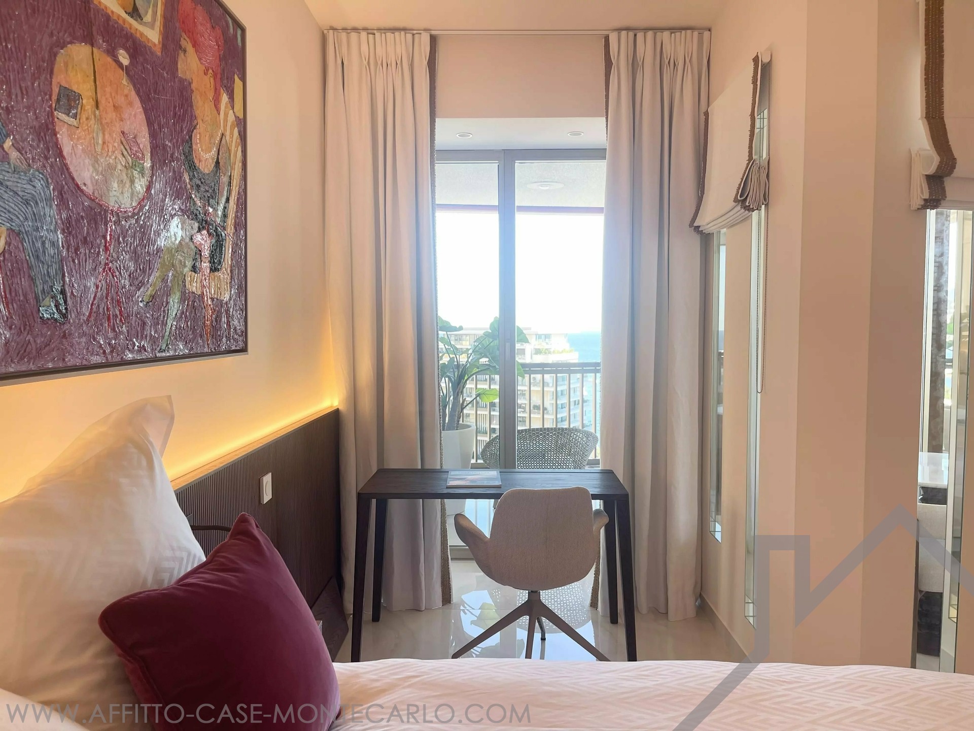 La chambre principale est équipée d’une télévision et d’un espace bureau. Le séjour et la chambre bénéficient d’un accès à une belle terrasse offrant une vue panoramique sur la mer, la plage du Larvotto et le Cap Martin. L’appartement dispose également d’un dressing et d’une salle de bains principale avec des finitions en marbre.