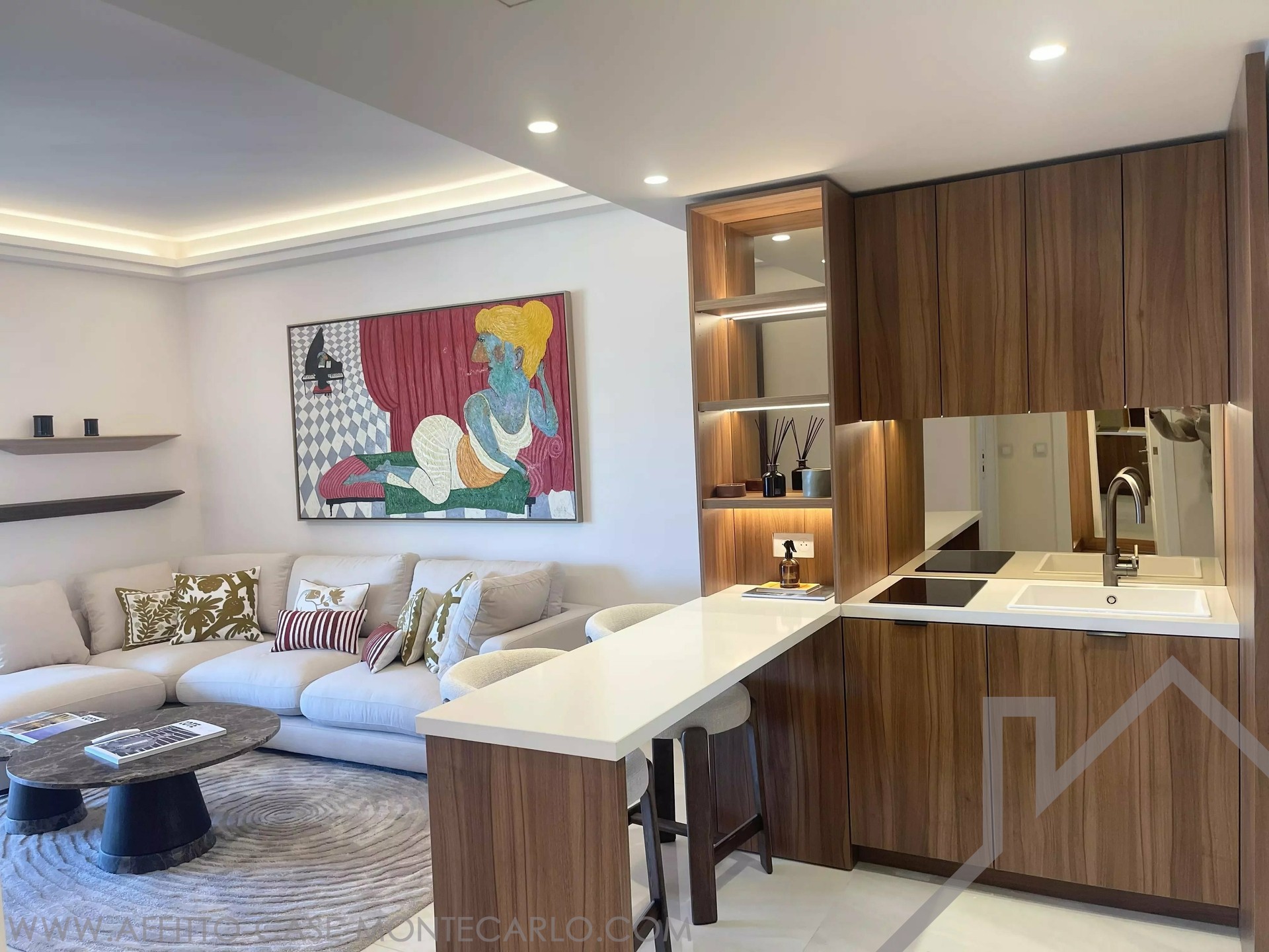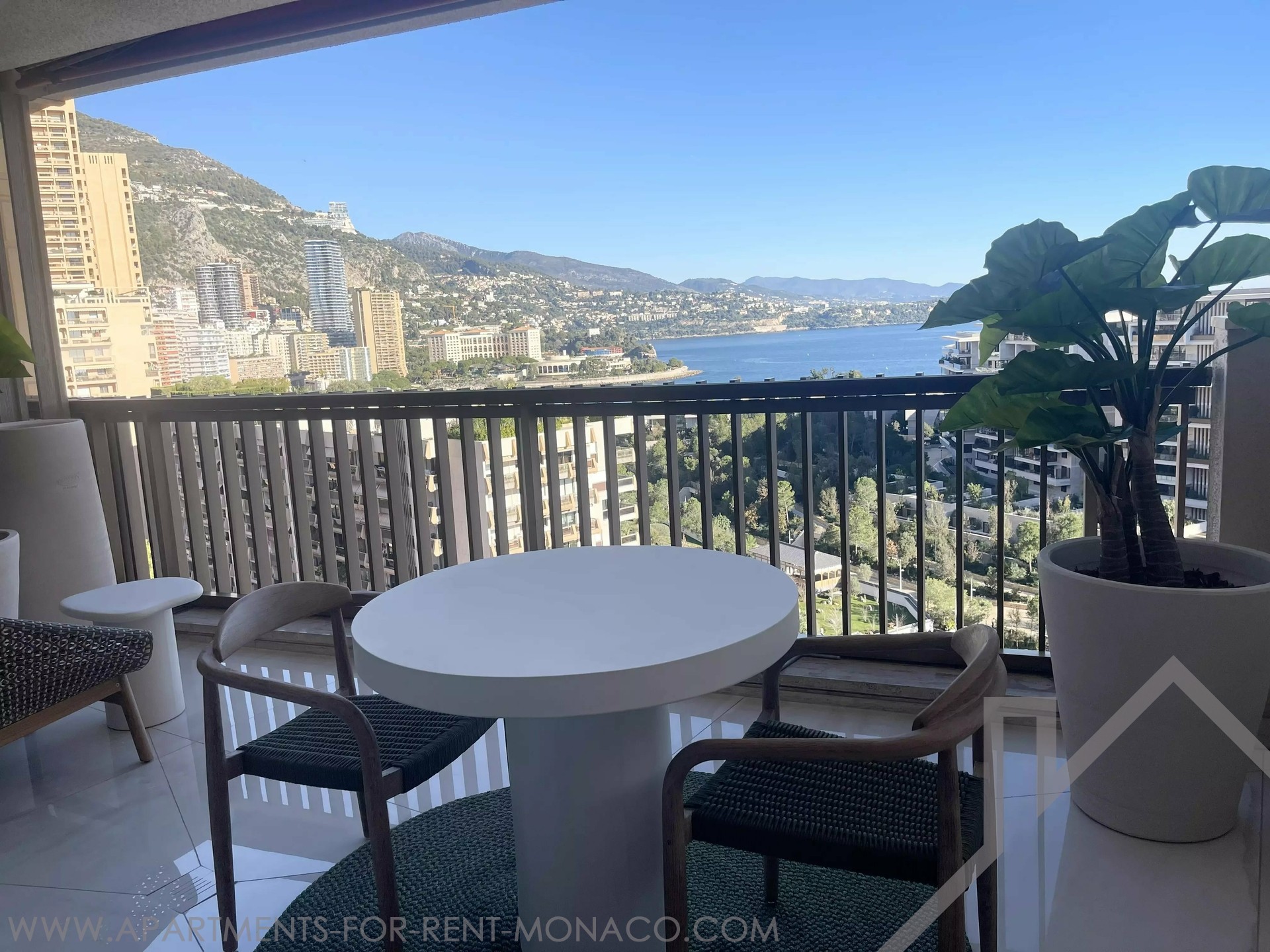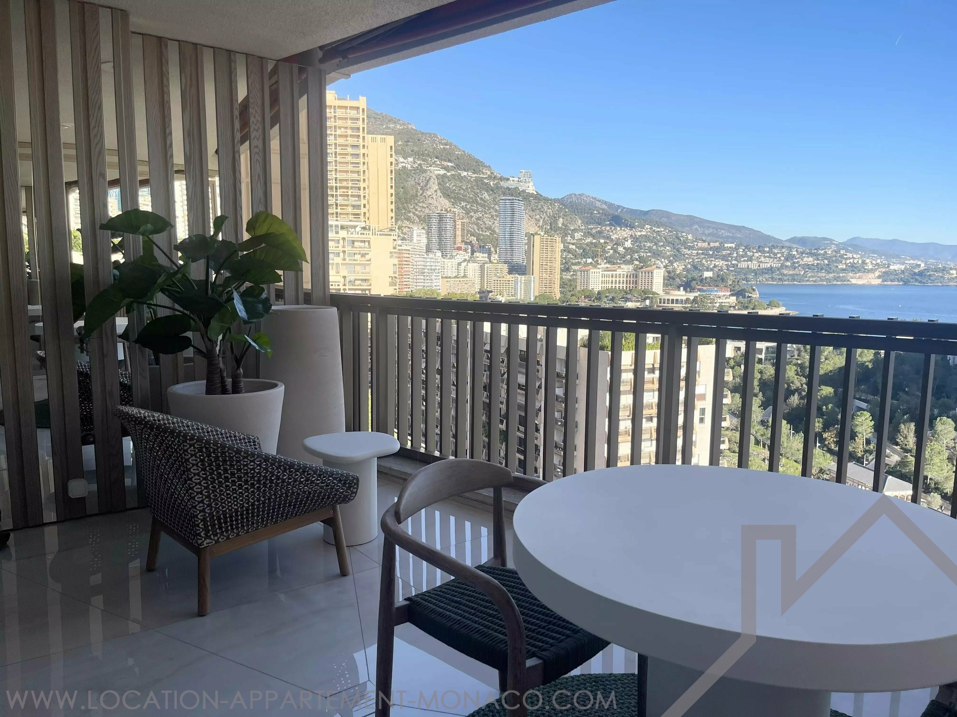 La chambre principale est équipée d’une télévision et d’un espace bureau. Le séjour et la chambre bénéficient d’un accès à une belle terrasse offrant une vue panoramique sur la mer, la plage du Larvotto et le Cap Martin. L’appartement dispose également d’un dressing et d’une salle de bains principale avec des finitions en marbre.
