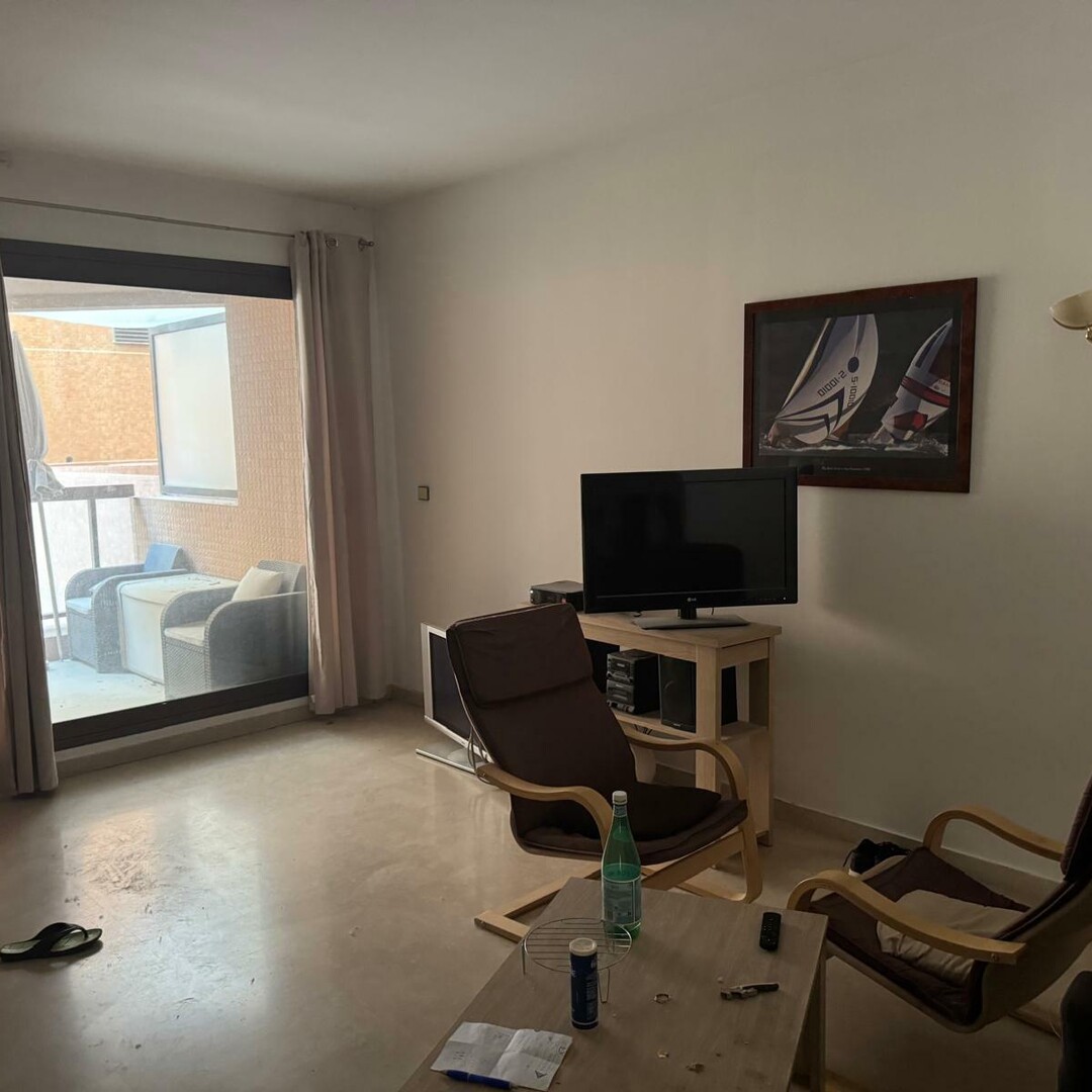 Grand studio avec entrée et placard, cuisine équipée, pièce principale, salle de bains et loggia.