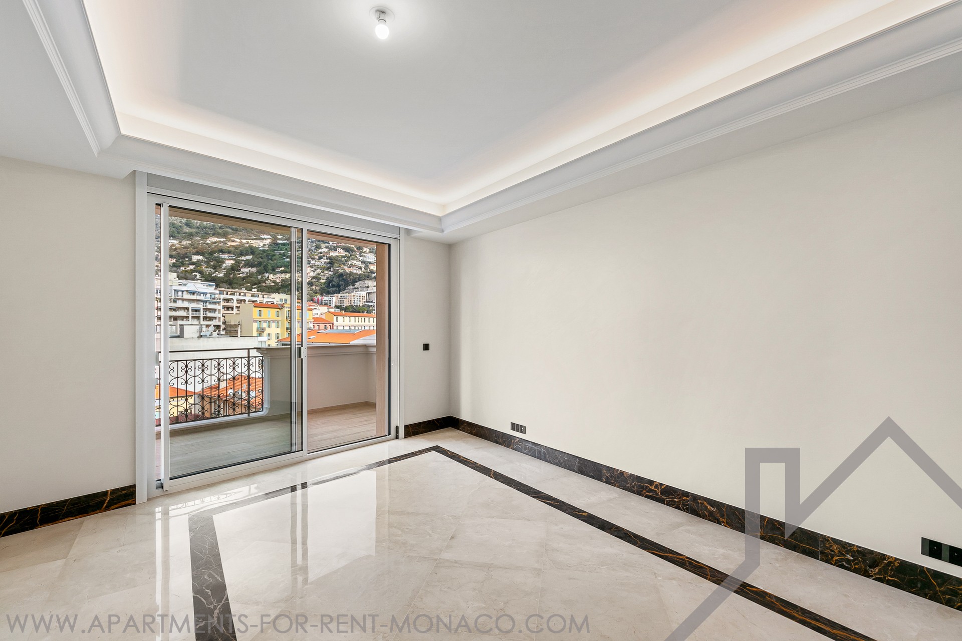 La pièce principale, aux volumes généreux, est agrémentée de murs en stuc et d’une corniche de plafond rétroéclairée, conférant à l’ensemble une atmosphère élégante et raffinée.