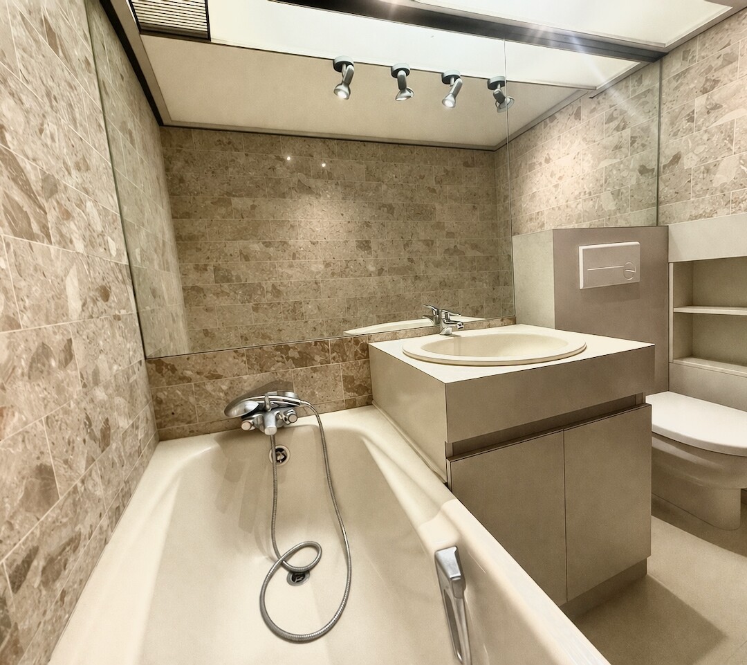 Entrée avec placard, séjour, kitchenette équipée, salle de bains complète, loggia, climatisation, double vitrage