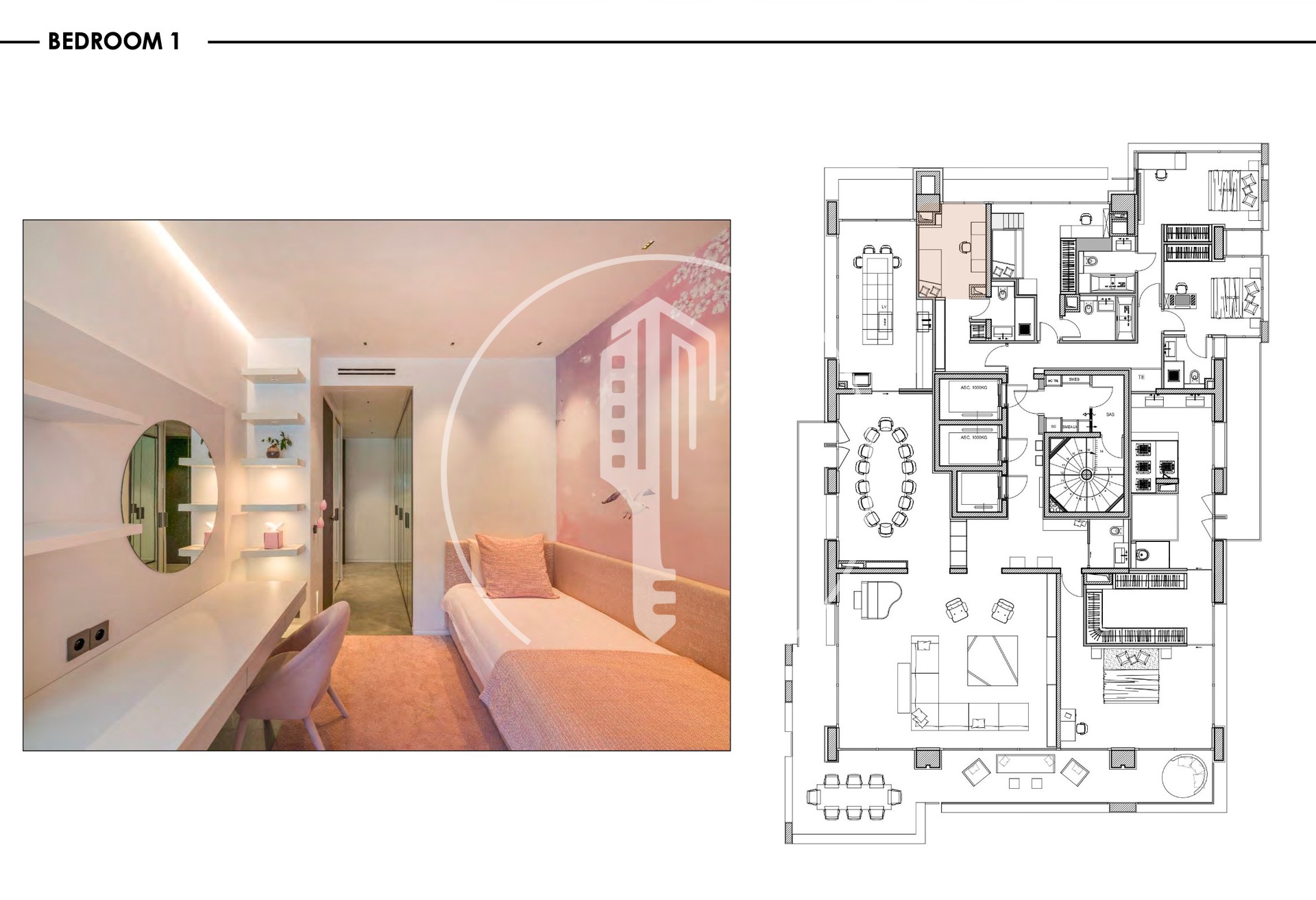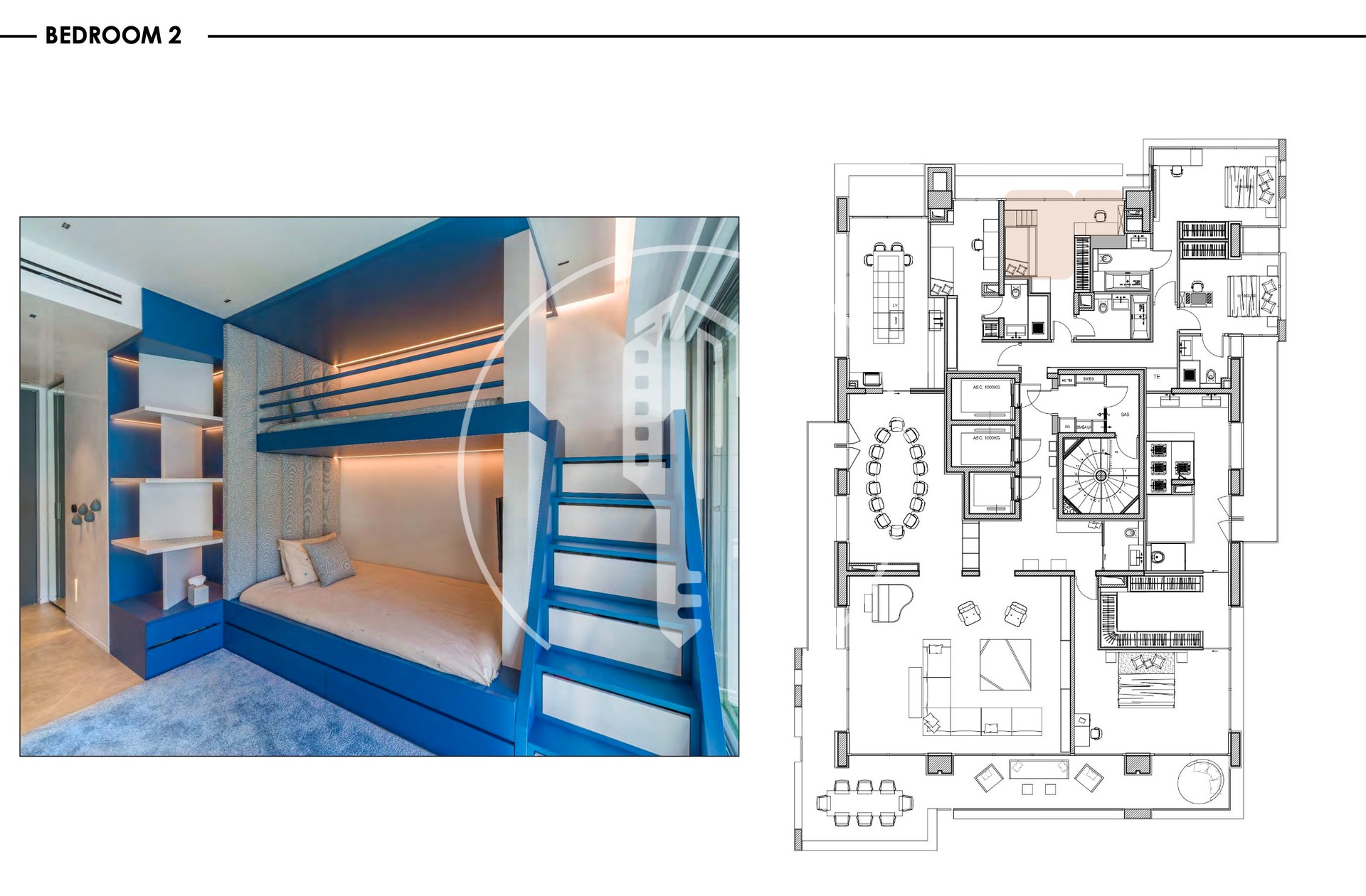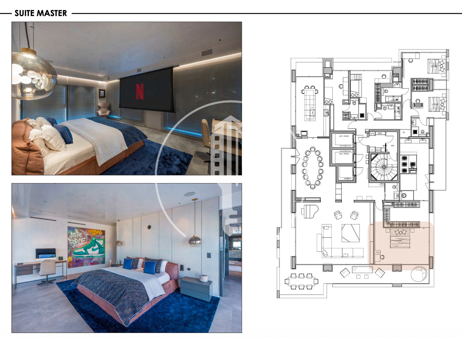L’appartement comprend 5 chambres, chacune avec sa propre salle de bain attenante. La chambre principale s’ouvre sur une grande terrasse et comprend un home cinéma, un dressing double ainsi qu’un spa avec jacuzzi.