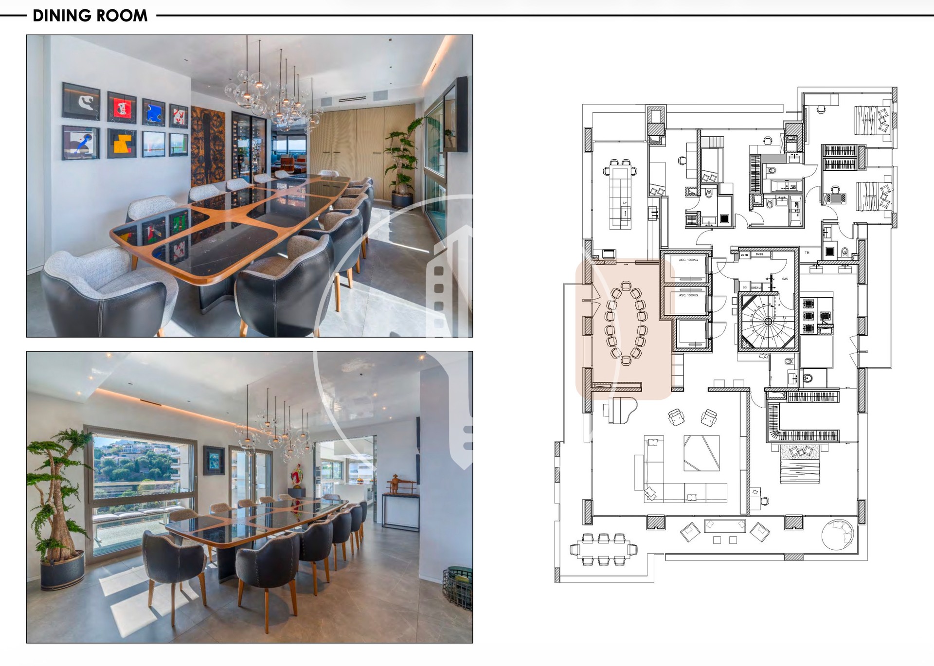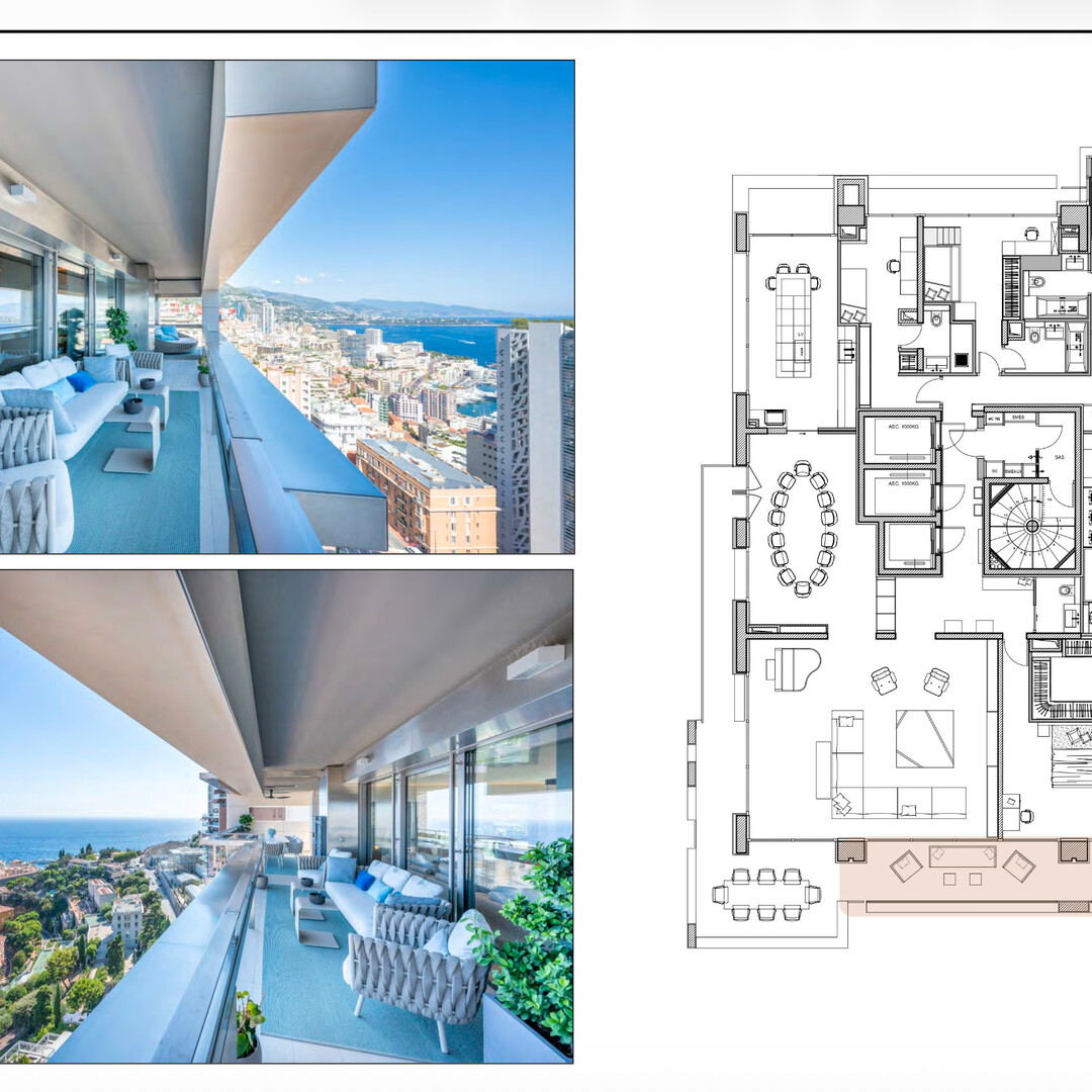 L’appartement dispose d’un vaste espace de vie avec son salon s’ouvrant sur une grande terrasse, offrant une vue panoramique à couper le souffle sur la Principauté, le Palais du Prince et le bleu infini de la mer Méditerranée.