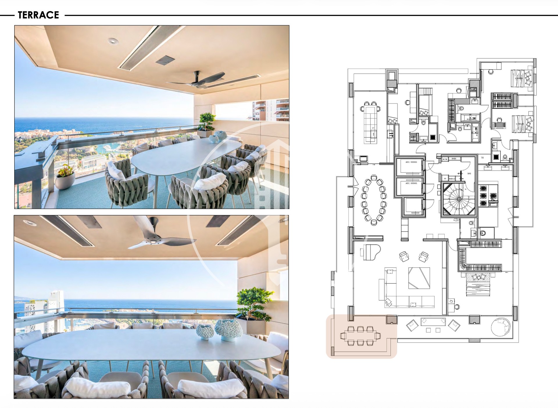 L’appartement dispose d’un vaste espace de vie avec son salon s’ouvrant sur une grande terrasse, offrant une vue panoramique à couper le souffle sur la Principauté, le Palais du Prince et le bleu infini de la mer Méditerranée.