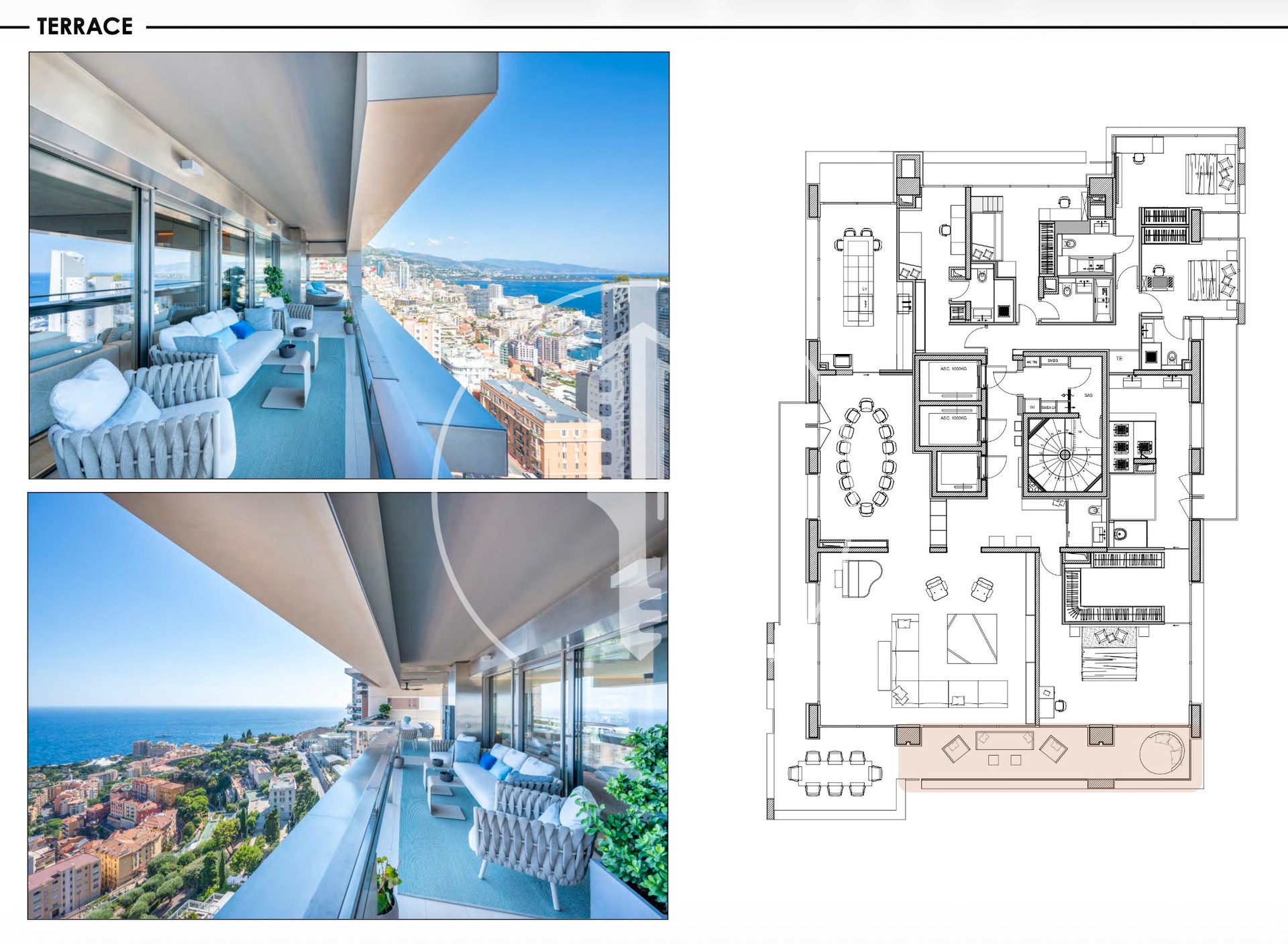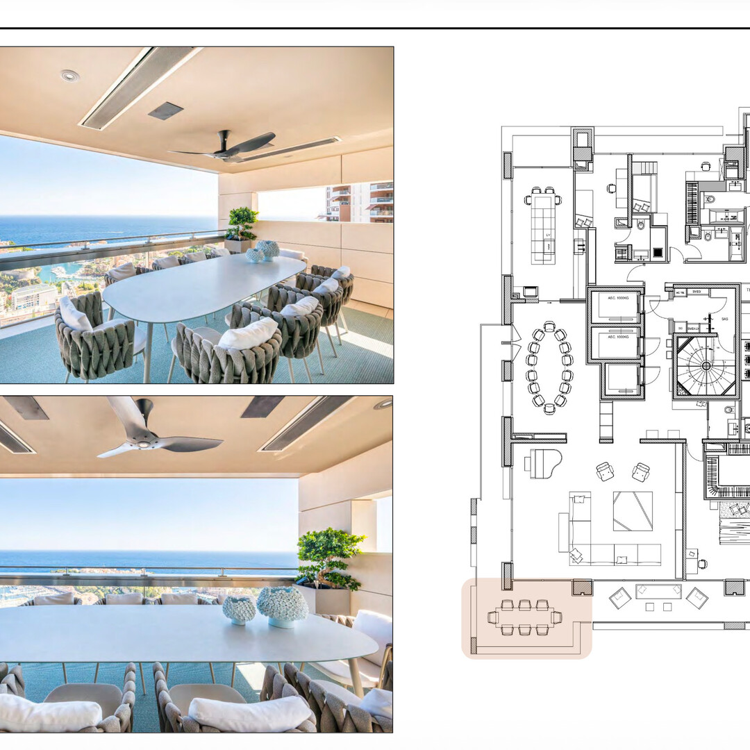 L’appartement dispose d’un vaste espace de vie avec son salon s’ouvrant sur une grande terrasse, offrant une vue panoramique à couper le souffle sur la Principauté, le Palais du Prince et le bleu infini de la mer Méditerranée.
