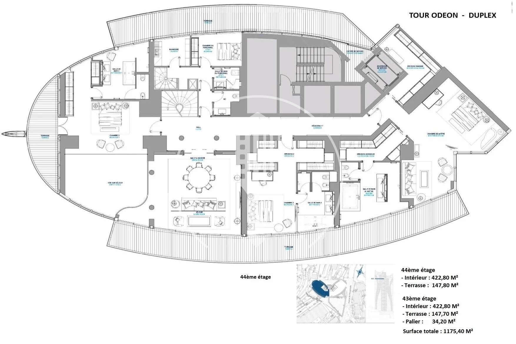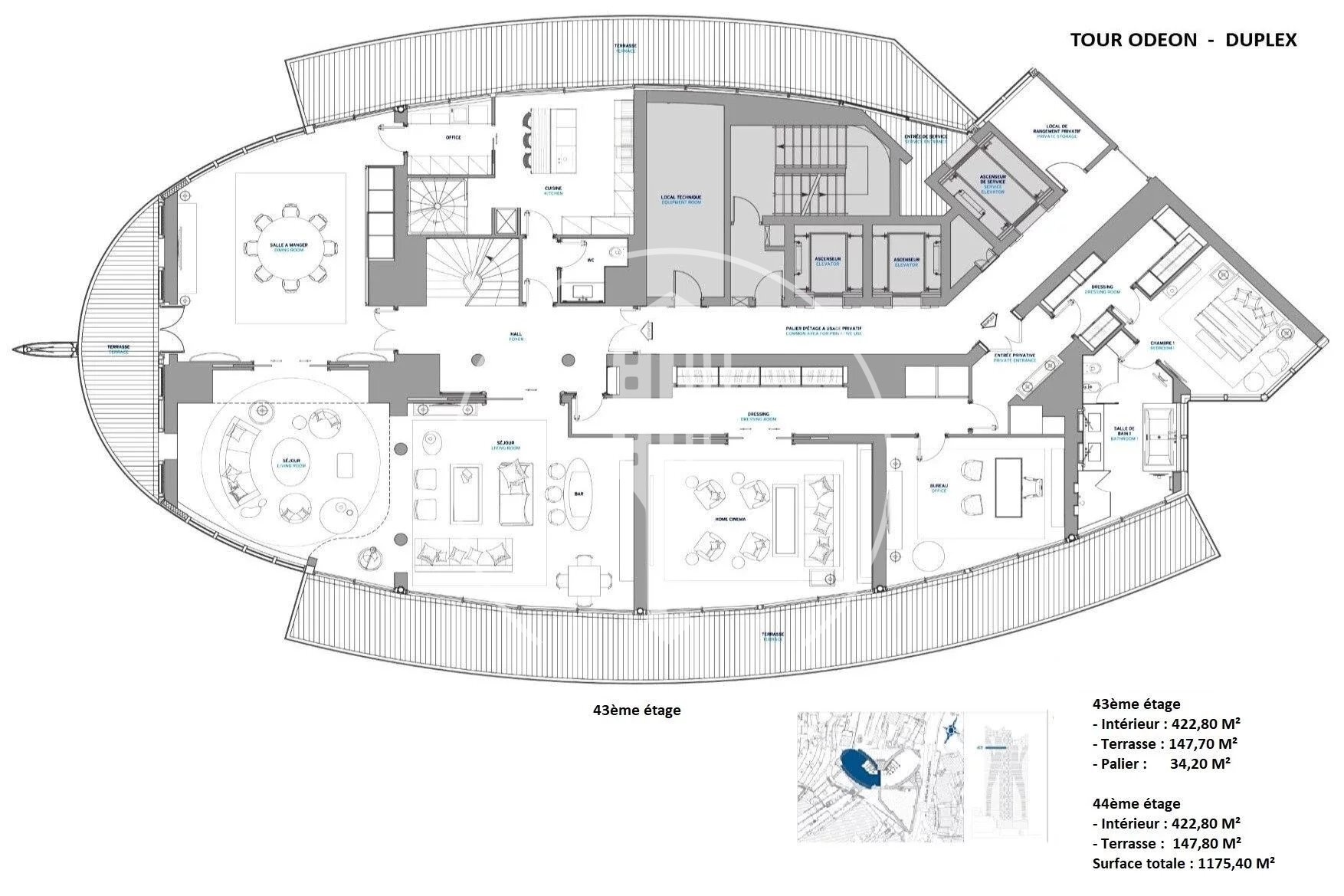 Plongez dans l’univers du luxe absolu et élevez votre quotidien à des sommets inégalés en découvrant l'exceptionnelle Tour Odéon. Ce prestigieux appartement en duplex, d'une superficie de 1175 m² et 7 pièces incarne le raffinement, offrant tranquillité et bien-être au cœur de Monaco, avec une vue panoramique sur la Méditerranée. Au sein de cette résidence d'exception, vous accédez à un ensemble des services haut de gamme, tels qu'une conciergerie, un voiturier, une navette privée, un spa, une piscine intérieure et un room-service exclusif du restaurant Cipriani. Chaque détail a été pensé pour allier esthétisme et technologie de pointe, créant un espace où luxe, modernité et fonctionnalité se rencontrent. Ce bien d'exception se distingue par un aménagement intérieur alliant esthétisme et technologie de pointe. Les deux étages de cet appartement raffiné offrent un décor somptueux, où luxe, modernité et fonctionnalité créent une atmosphère unique.