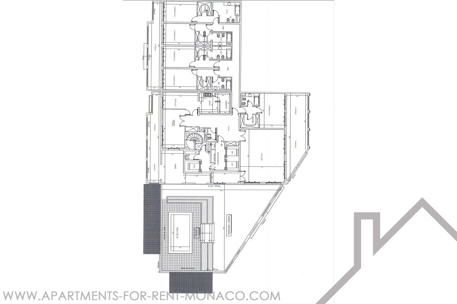 Il se compose d'une entrée, séjour, salle à manger, cuisine équipée, office, 5 chambres 5 salles de bains et douches, 3 dressings, 1 wc invité.