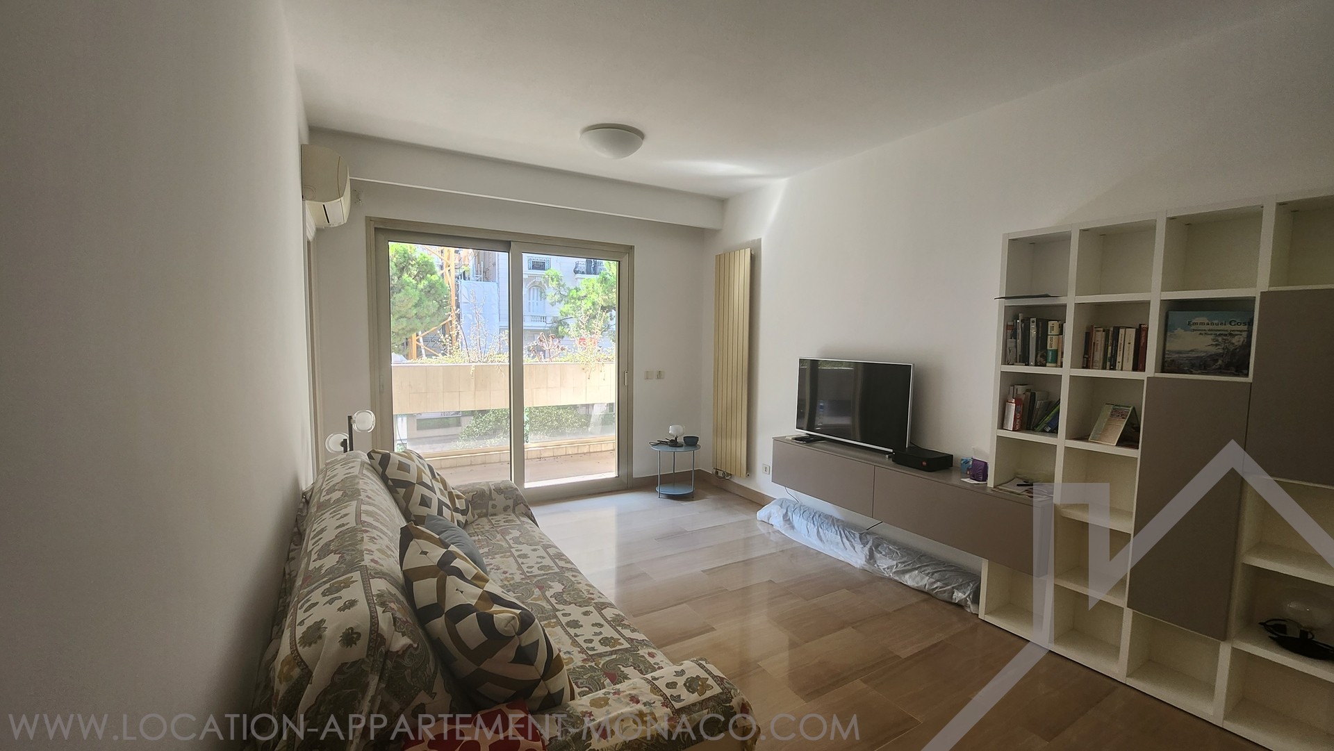 un séjour avec un très grand placard mural,