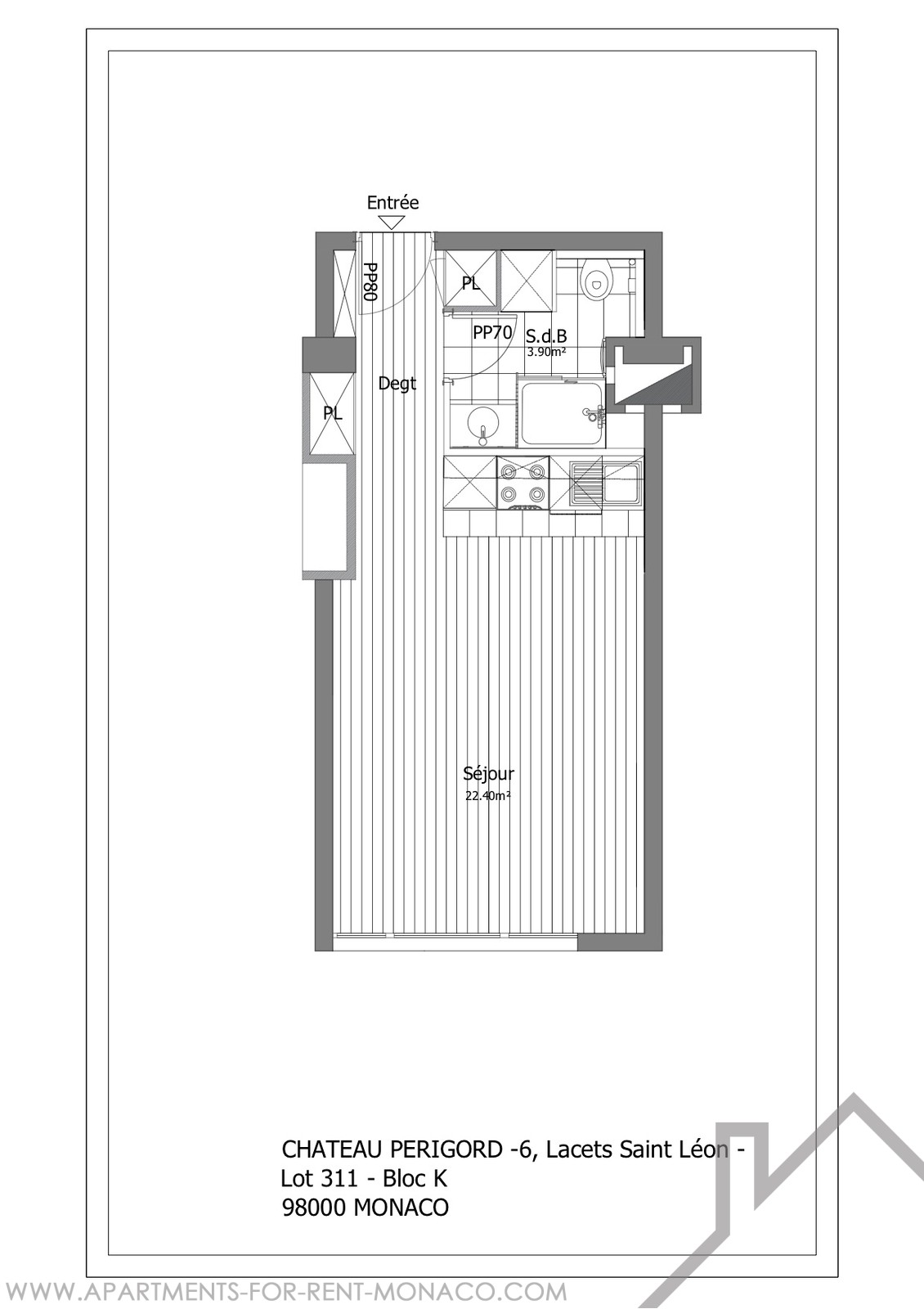 Il est composé d'un hall d'entrée avec placards, un séjour avec cuisine américaine entièrement équipée, une salle de douche avec toilettes.