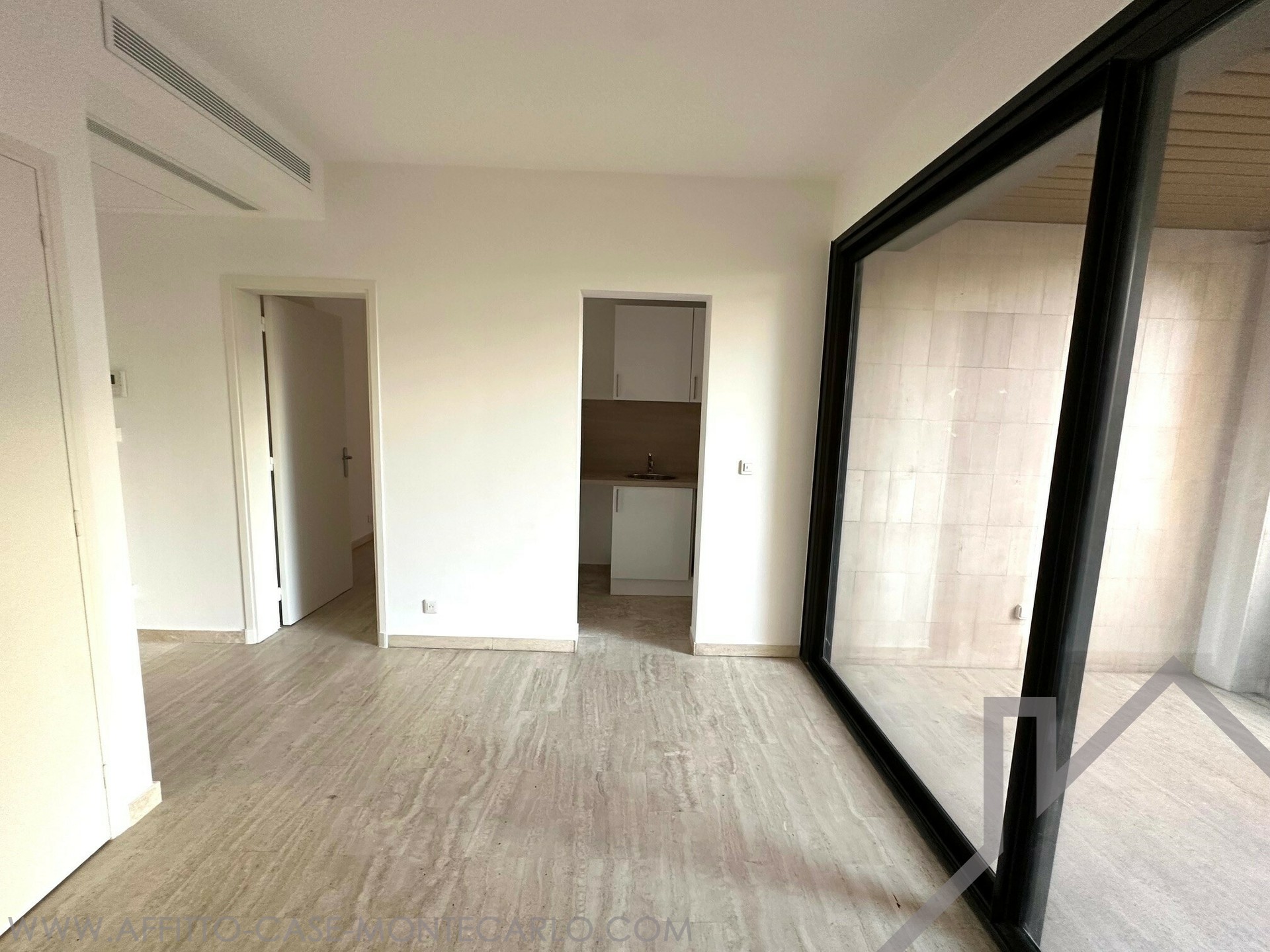 Un appartement 2 pièces se composant d'un séjour ouvrant sur une loggia, une kitchenette, une chambre ouvrant sur une seconde loggia, une salle de douche et un toilette.